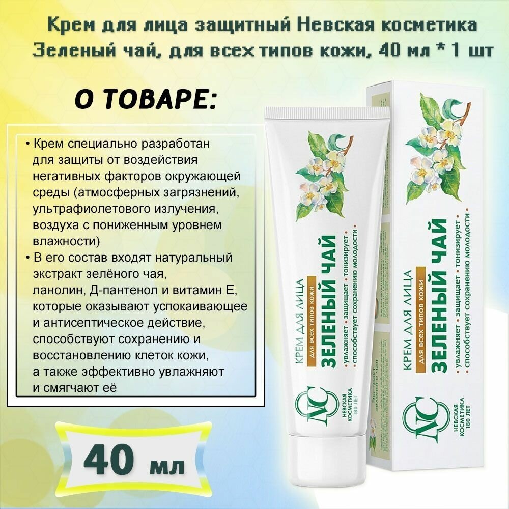 Крем для лица Невская Косметика Зеленый чай защитный для всех типов кожи 40 мл - специально разработан для защиты от воздействия негативных факторов окружающей среды (атмосферных загрязнений, ультрафиолетового излучения, воздуха с пониженным уровнем влажности). В его состав входят натуральный экстракт зелёного чая, ланолин, D-пантенол и витамин E, которые оказывают успокаивающее и антисептическое действие, способствуют сохранению и восстановлению клеток кожи, а также эффективно увлажняют и смягчают её. Крем