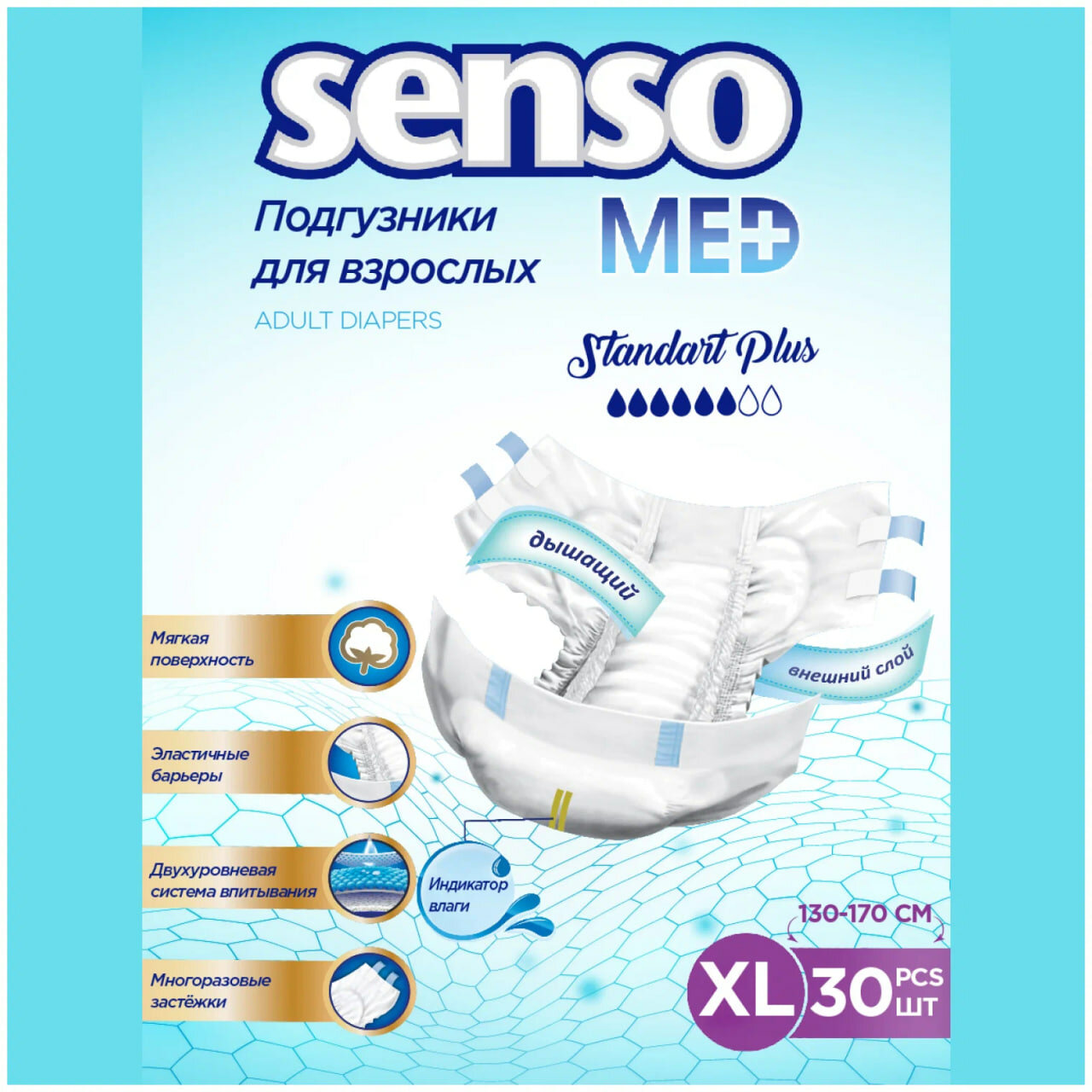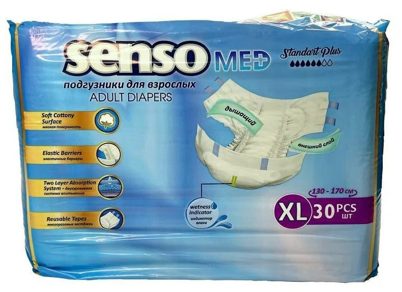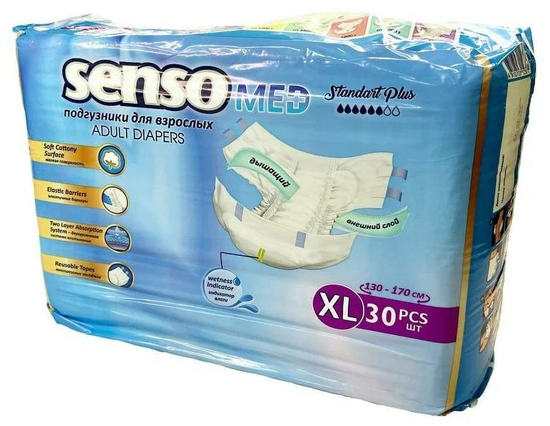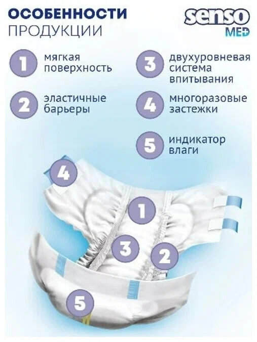 Подгузники для взрослых " Senso Med" предназначены для людей, испытывающих проблемы с инконтиненцией (недержание). Особенно удобны для малоподвижных и лежачих пациентов – многоразовые застёжки Reusable Tapes.