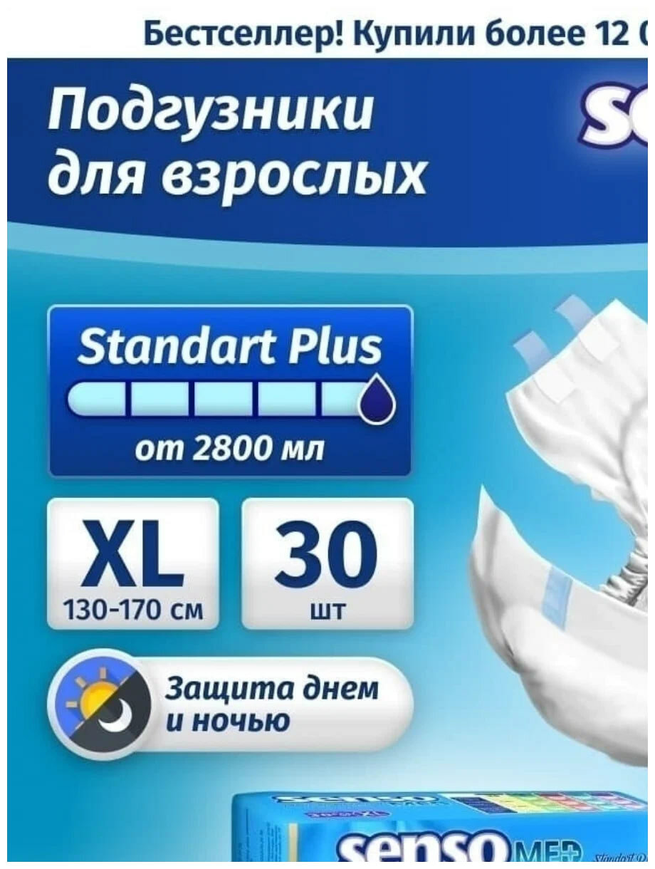 Подгузники для взрослых одноразовые Standart Plus Med Senso/Сенсо обхват 100-145см 30шт р.L ООО БелЭмса (2254192) (размер: L (50-52))