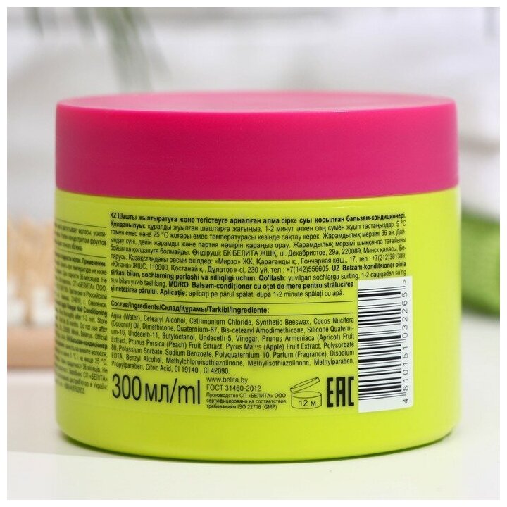 | Состав | вода, цетеариловый спирт, хлорид цетримония, воск пчелиный синтетический, бис-цетеарил амодиметикон, цетеарет-7, цетеарет -25, кватерниум-87, диметикон, масло Cocos Nucifera (кокоса), парфюмерная композиция, силикон кватерниум-16, ундецет-11, бутилоктанол, ундецет-5, поликватерниум-10, Уксус, экстракт плодов абрикоса (Prunus Armeniaca (Apricot)), экстракт плодов персика (Peach), экстракт плодов яблока (Pyrus Malus (Apple), полисорбат-80, сорбат калия,бензоат натрия, ЭДТА динатрия, бензиловый спирт, метилхлоризотиазолинон, метилизотиазолинон, метилпарабен, пропилпарабен, кислота лимонная, краситель зелёный |