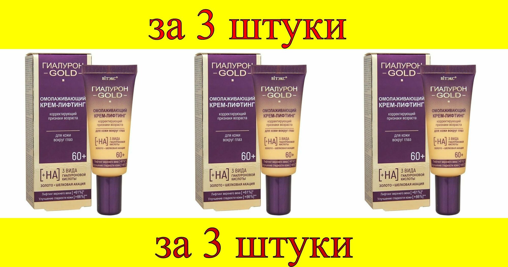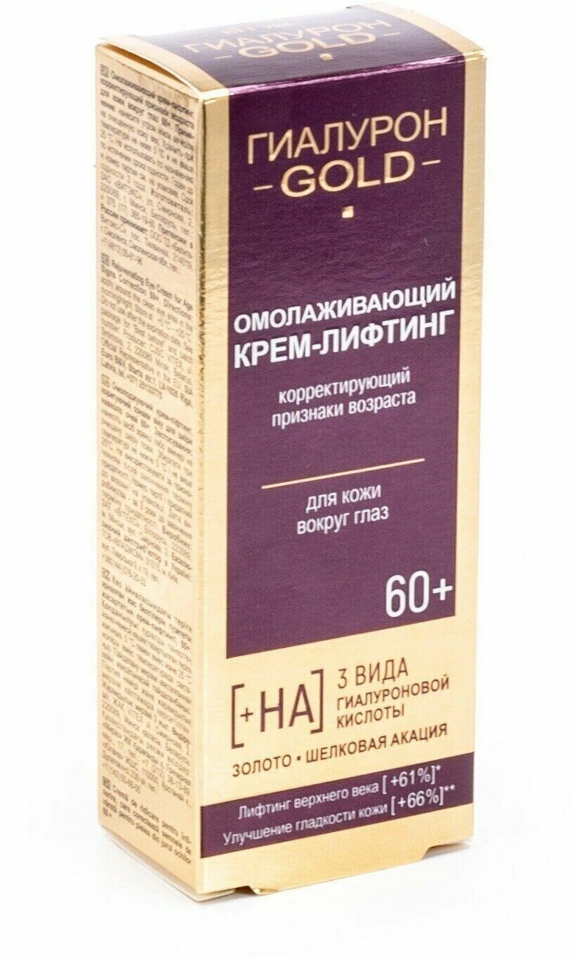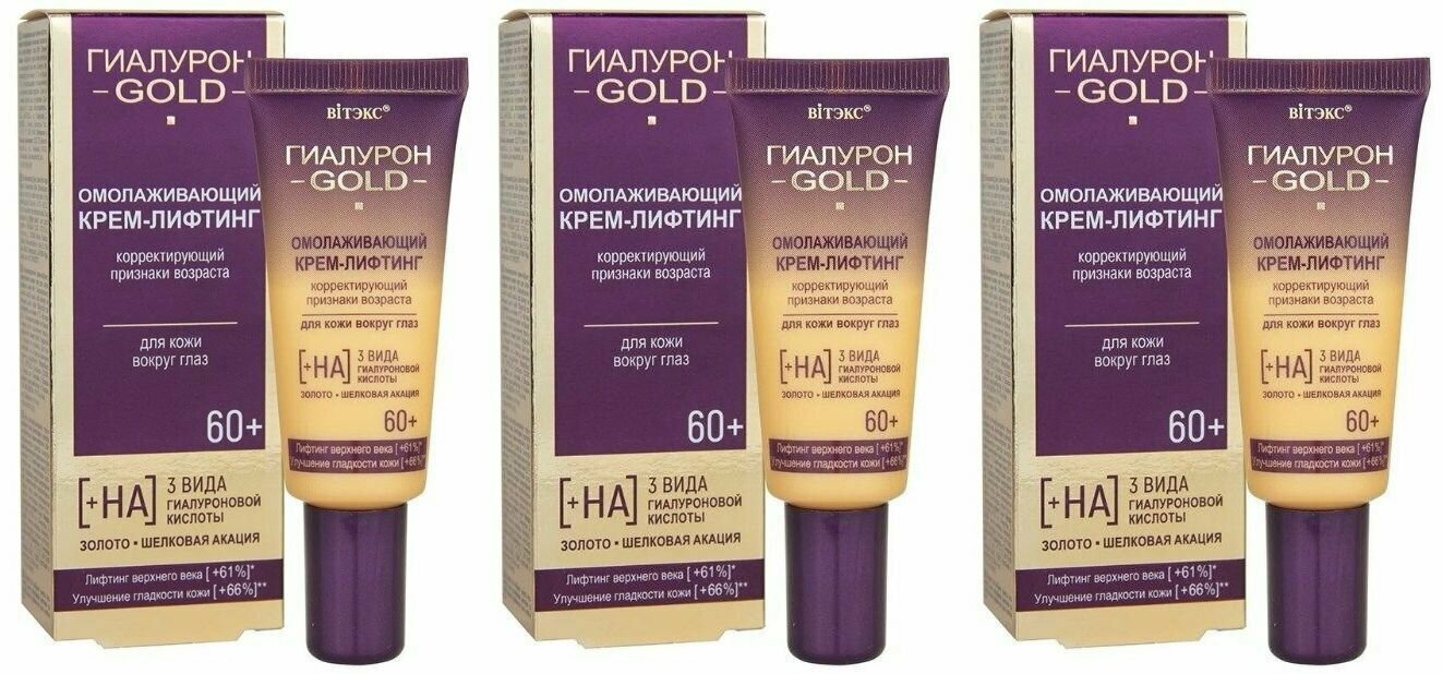 Омолаживающий крем-лифтинг разработан с учетом особенностей и потребностей кожи в возрасте после 60 лет.«Умная» формула, в составе которой 3 вида гиалуроновой кислоты, биозолото, шелковая акация и сложные высоконаучные омолаживающие и осветляющие комплексы, оказывает направленное действие на все признаки возраста: уменьшает мимические и глубокие морщинки вокруг глаз, снимает отечность, подтягивает кожу верхнего и нижнего века, осветляет темные круги, освежает взгляд. Сразу после нанесения крема мгновенно возникает эффект подтяжки, который сохраняется в течение всего дня. Особые лифтинг-компоненты образуют на коже невидимую поддерживающую микросеточку-корсет против морщин. Биозолото выступает в роли проводника, позволяя активным компонентам быстрее и глубже проникать в кожу, значительно повышая эффективность их воздействия, усиливая процессы омоложения. В комплексе с гиалуроновой кислотой и шелковой акацией помогает восстановить объем мягких тканей и структуру кожи в месте образования морщин, обеспечивает активное укрепление структуры кожи, защищает от возрастных изменений. В комплекте 3 штуки
