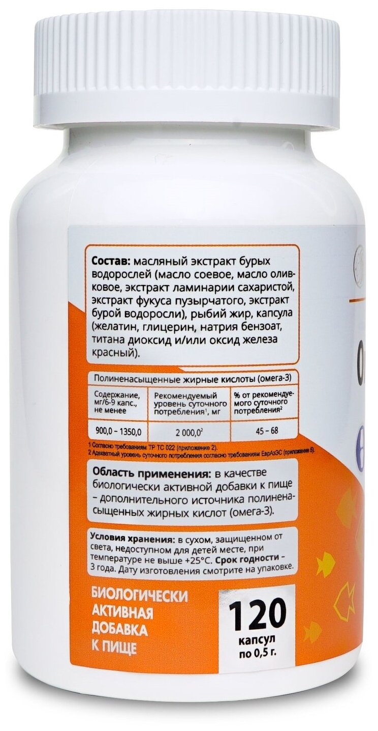 | Состав | Масляный экстракт бурых водорослей (масло соевое, масло оливковое, экстракт ламинарии сахаристой, экстракт фукуса пузырчатого, экстракт бурой водоросли), рыбий жир, капсула |