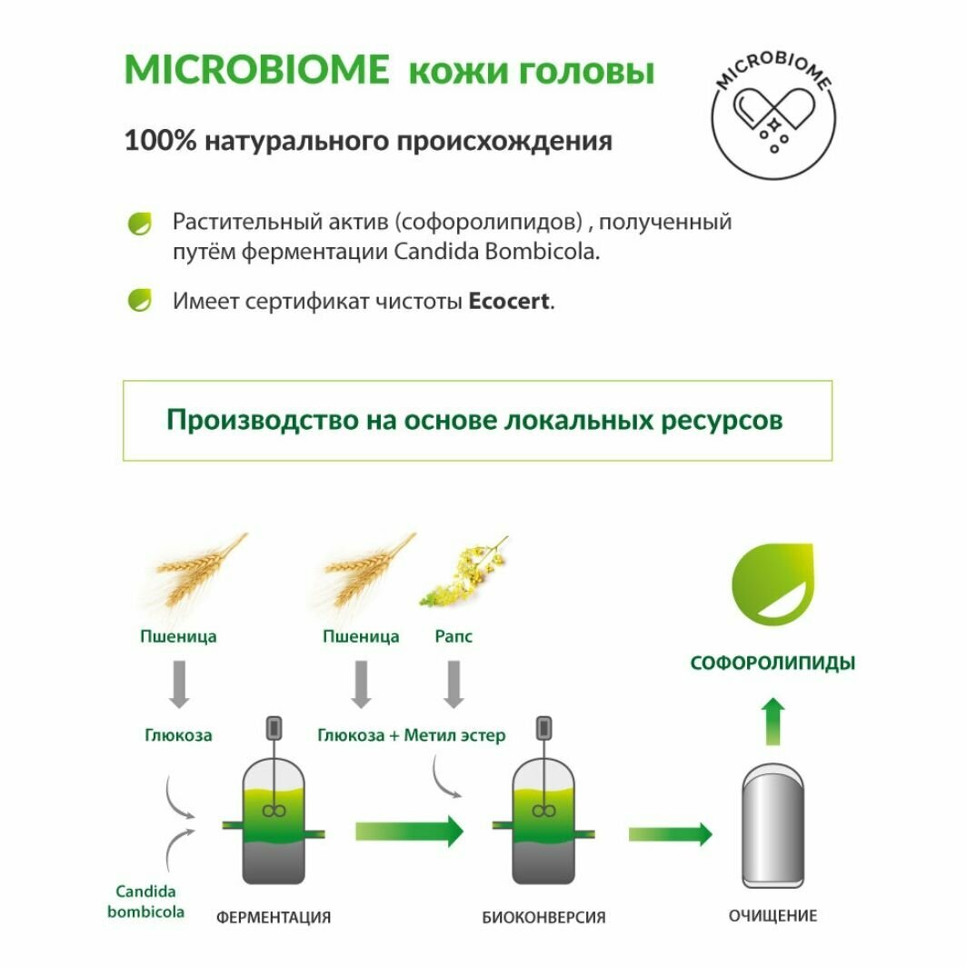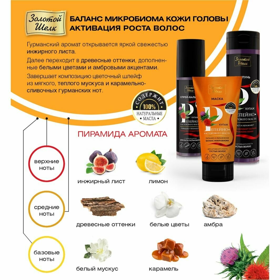 "Шампунь «купаж репейно-касторового масла» для активного роста густых волос Эффективно очищает кожу головы. В основе формулы содержится натуральный купаж из репейного и касторового масел, который в сочетании с кондиционирующим комплексом повышает прочность волосяного стержня и способствует росту густых волос. Купаж репейного и касторового масел получен без воздействия критических температур для максимального сохранения полезных свойств масел. Натуральные масла улучшают состояние кожи головы и волос, способствуют укреплению корней. Здоровая кожа головы = здоровые и сильные волосы Сбалансированный микробиом кожи головы . Спешл MicroBiome Специальный активный компонент усиливает барьерные функции кожи, обеспечивает длительное увлажнение кожи головы. Способствует восстановлению баланса микробиома кожи головы, уменьшая количество кожного сала и шелушения. "