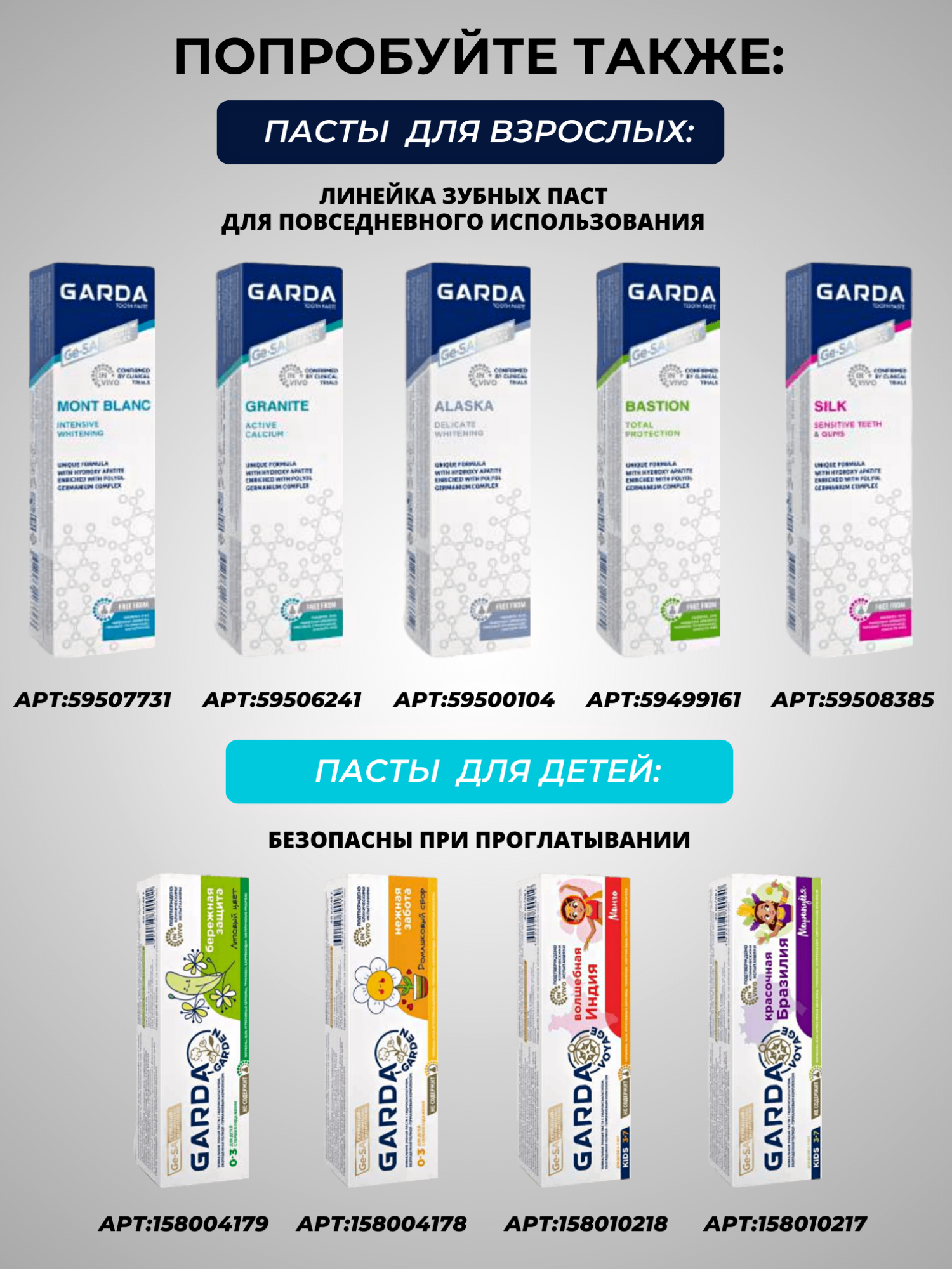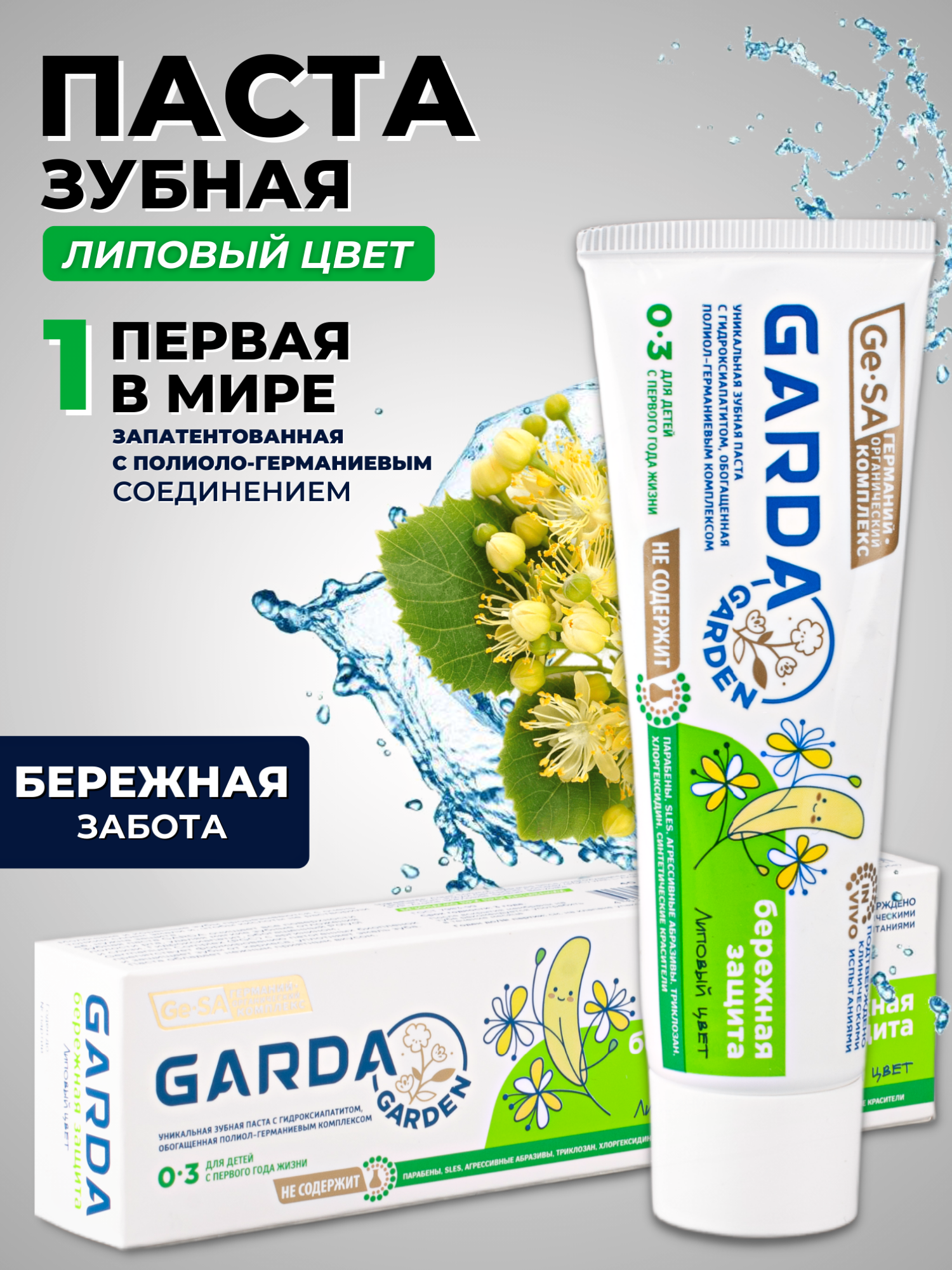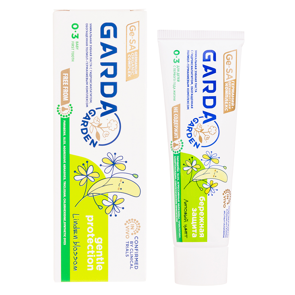 Зубная паста для детей GARDA Нежная забота BABY 0-3 , это безопасная и натуральная защита зубов и десен с самого рождения. Молочные и коренные зубы прорезываются с очень тонким слоем эмали и чтобы кислоты не растворили её, нужна защита. Зубная паста очищает все поверхности полости рта удаляя мягкие зубные отложения. Гидроксиапатит обогащенный Polyol Germanium Complex (PGC) с аргинином, препятствует формированию патогенных биопленок и защищает зубы от кариеса, уплотняет эмаль зуба, востанавливает баланс микрофлоры полости рта. Паста обладает нежным приятным фруктовым вкусом.