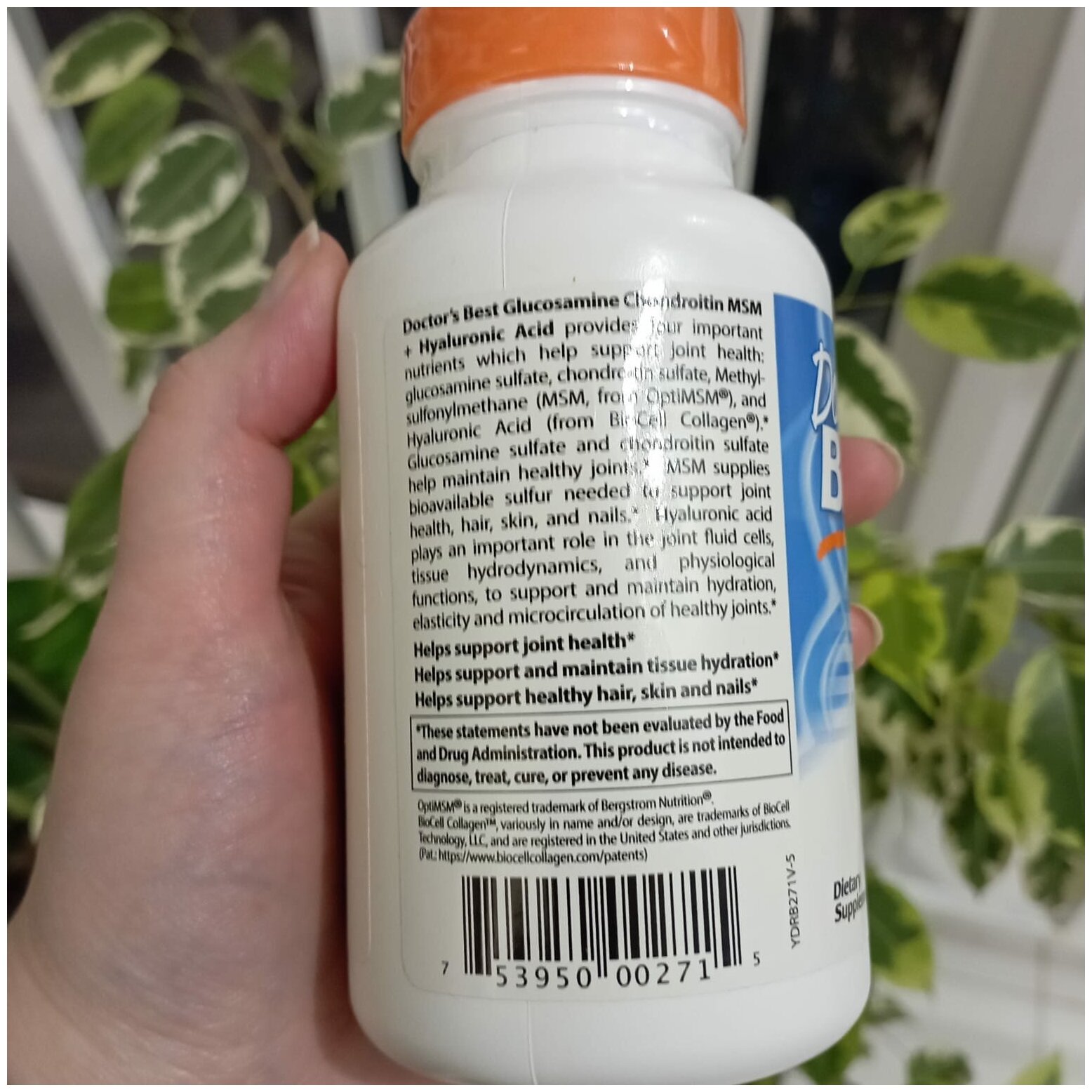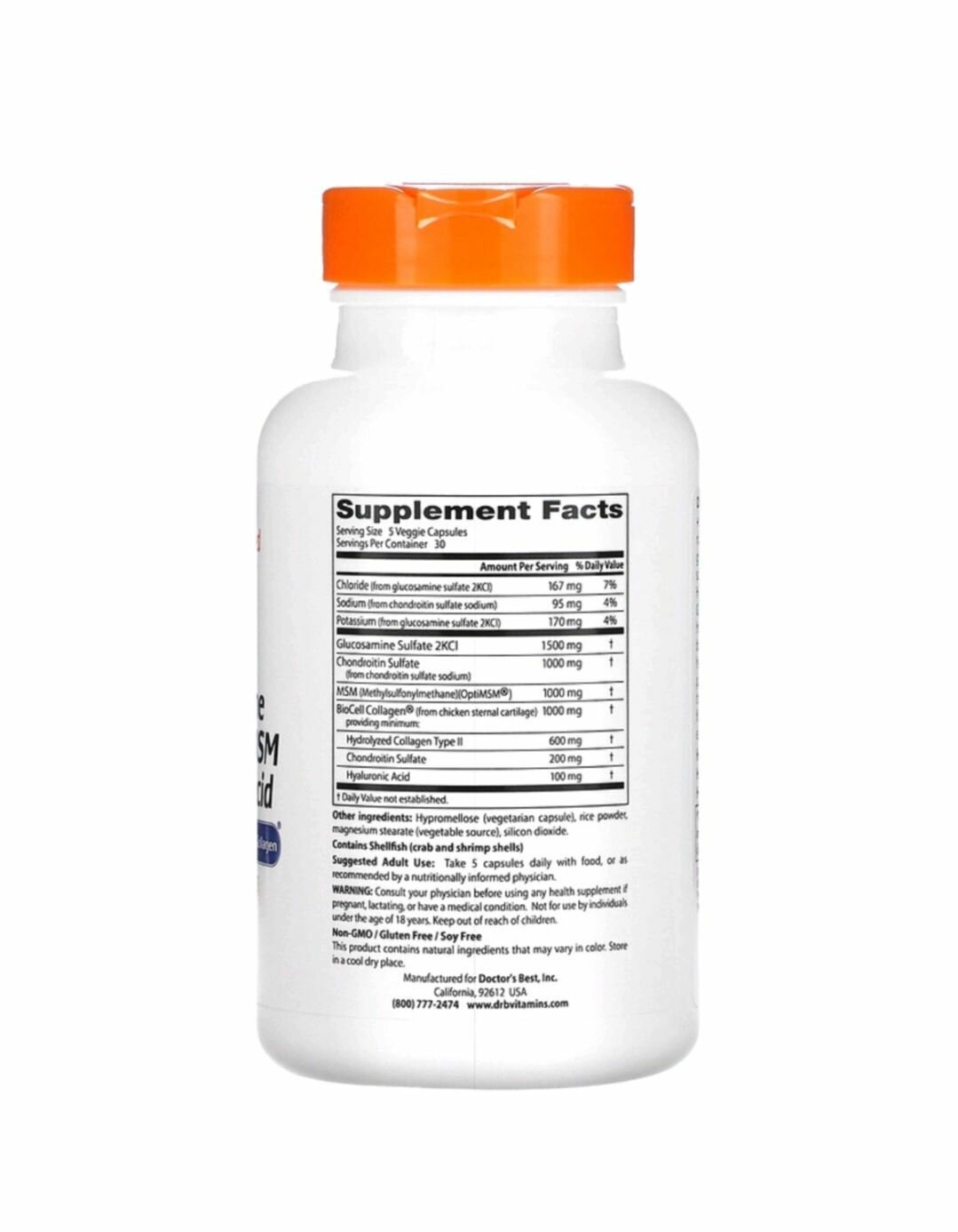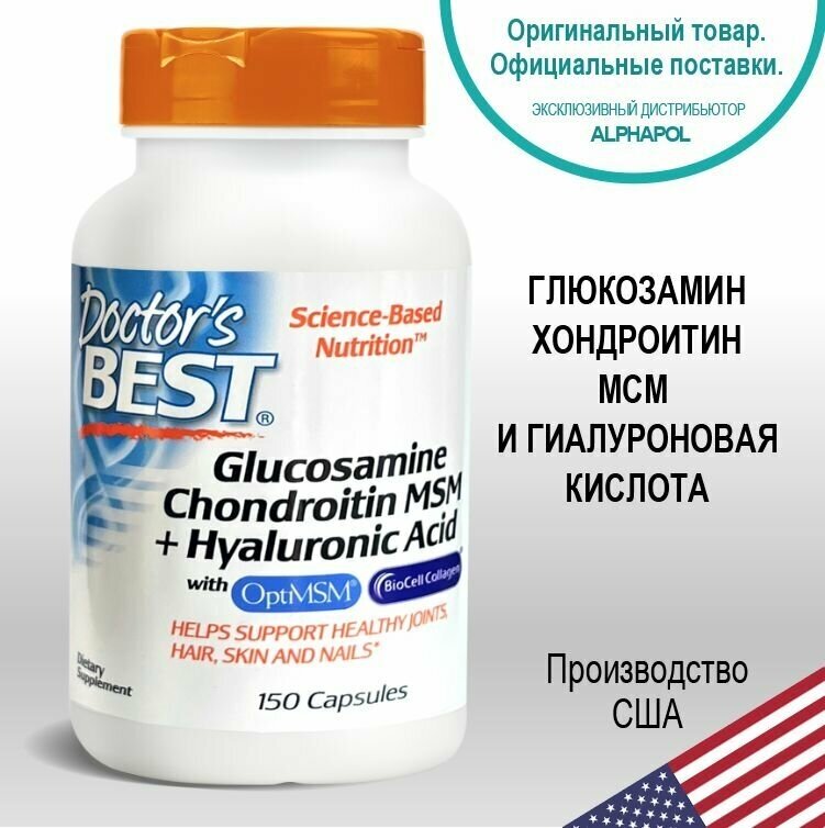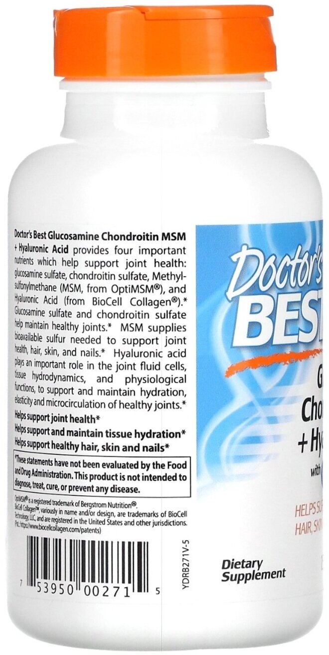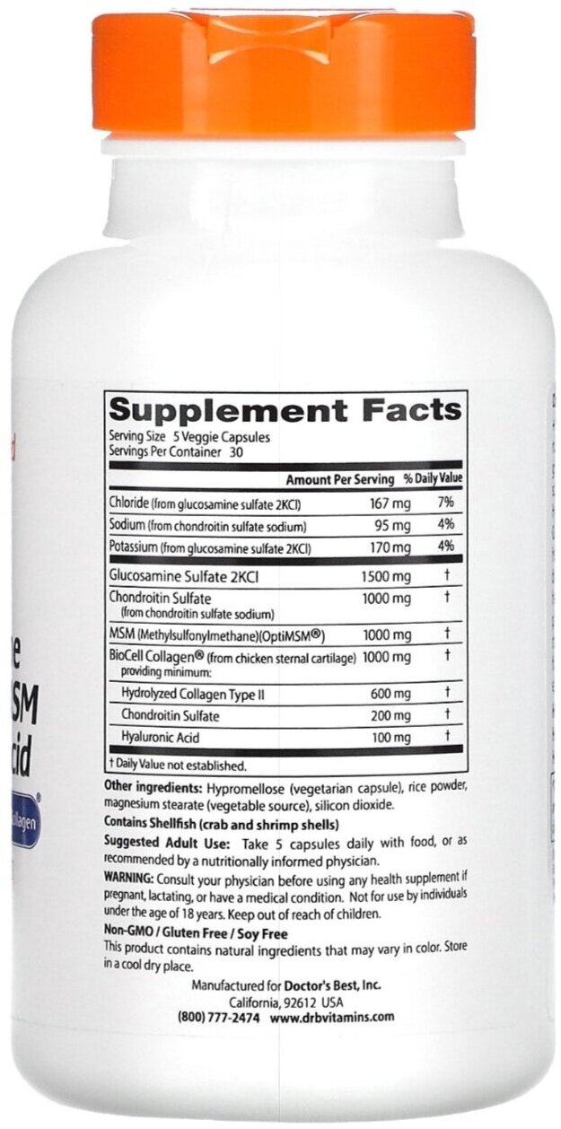 Формула Doctor’s Best с глюкозамином, хондроитином, метилсульфонилметаном и гиалуроновой кислотой содержит четыре важных питательных вещества, полезных для суставов и соединительных тканей: глюкозамин, хондроитин, метилсульфонилметан (MSM из OptiMSM) и гиалуроновую кислоту (коллаген BioCell). Глюкозамин сульфат полезен для смазки суставов, обеспечивая большую подвижность и гибкость. Хрящ, состоящий из протеогликанов, в основном находится на костях и вблизи суставов и состоит из коллагенового белка с боковыми цепями, которые называются сульфатом хондротина. Метилсульфонилметан снабжает организм биодоступной серой, которая необходима для здоровья суставов. Коллаген BioCell Collagen — проверенный ингредиент, содержащий запатентованную смесь из гидролизованного коллагена типа II, сульфата хондротина и гиалуроновой кислоты в биодоступной форме. Помогает обеспечить крепость, гибкость и здоровье суставов, улучшает состояние волос, кожи и суставов, полезен для соединительных тканей.