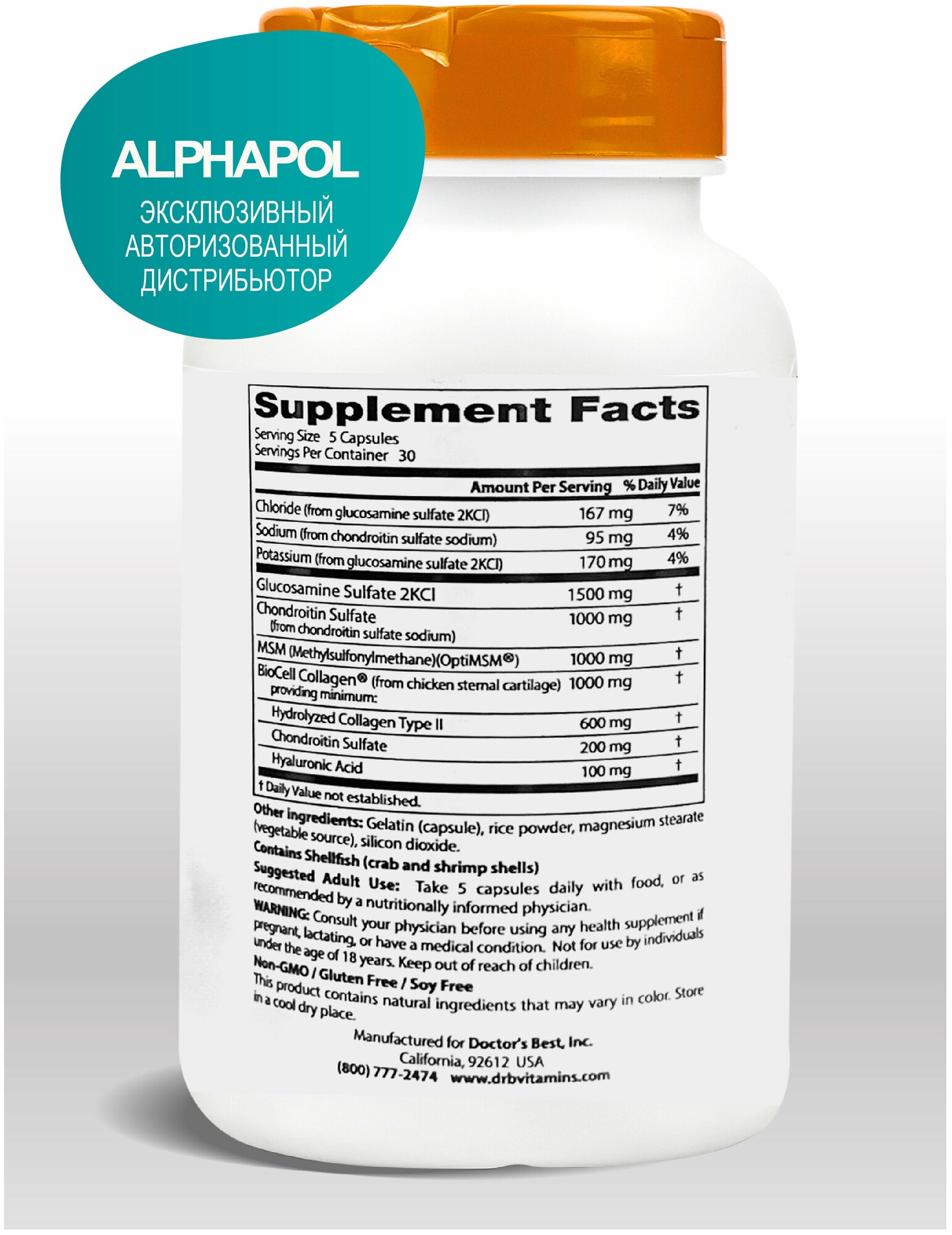 | Состав | Хлорид (из глюкозамина сульфата 2KCl), натрий (из хондроитина сульфата натрия), калий (из глюкозамина сульфата 2KCl), сульфат глюкозамина 2KCl, хондроитинсульфат (из натрия хондроитинсульфата), МСМ (метилсульфонилметан) (OptiMSM), коллаген BioCell, гипромеллоза (вегетарианская капсула), рисовый порошок, стеарат магния (растительного происхождения), диоксид кремния, моллюски (панцири крабов и креветок) |