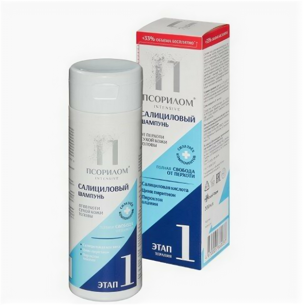 ПСОРИЛОМ ШАМПУНЬ САЛИЦИЛ ПРОТИВ СУХОЙ ПЕРХОТИ - благодаря силе трех активных компонентов шампунь эффективно устраняет 100% видимой перхоти и предотвращает ее повторное появление. Внешний вид и свойства: однородная масса белого цвета с приятным ароматом парфюмерной композиции Возраст: с 14 лет Шампунь бережно очищает кожу головы. Мягкая моющая основа не вызывает раздражения. АКТИВНЫЕ ИНГРЕДИЕНТЫ: САЛИЦИЛОВАЯ КИСЛОТА: