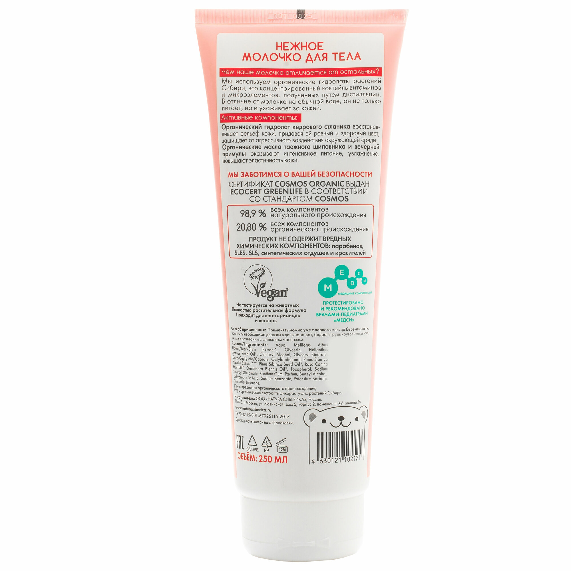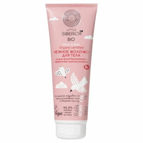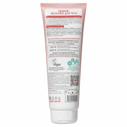 Нежное молочко для тела Чем наше молочко отличается от остальных? Мы используем органические гидролаты растений Сибири, это концентрированный коктейль витаминов и микроэлементов, полученных путем дистилляции. В отличие от молочка на обычной воде, он не только питает, но и ухаживает за кожей. Активные компоненты Органический гидролат кедрового стланика выравнивает текстуру кожи, придает ей ровный и здоровый цвет, защищает от агрессивного воздействия окружающей среды. Органические масла таежного шиповника и вечерней примулы оказывает интенсивное увлажнение, питание и повышение эластичности кожи. Мы заботимся о вашей безопасности Сертификат COSMOS ORGANIC выдан ECOCERT GREENLIFE в соответствии со стандартом COSMOS 98,7 % всех компонентов натурального происхождения 20,2% всех компонентов органического происхождения Продукт не содержит вредных химических компонентов: парабенов, SLES, SLS, отдушек и красителей.