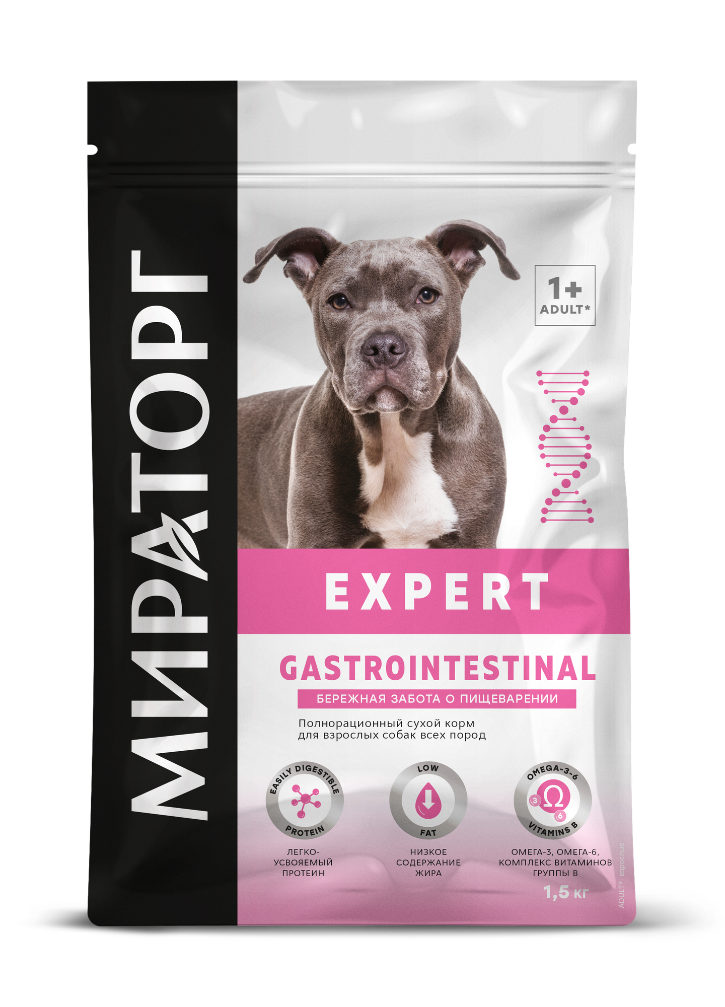 Мираторг Expert - профессиональная линейка кормов, созданная на базе современных научных исследований в нутрициологии. Сбалансированные рационы Мираторг Expert помогают вашим питомцам поддерживать здоровье и жизненную энергию. Gastrointestinal – ветеринарная диета, для защиты пищеварительной системы, которая способствует нормализации работы желудочно-кишечного тракта.