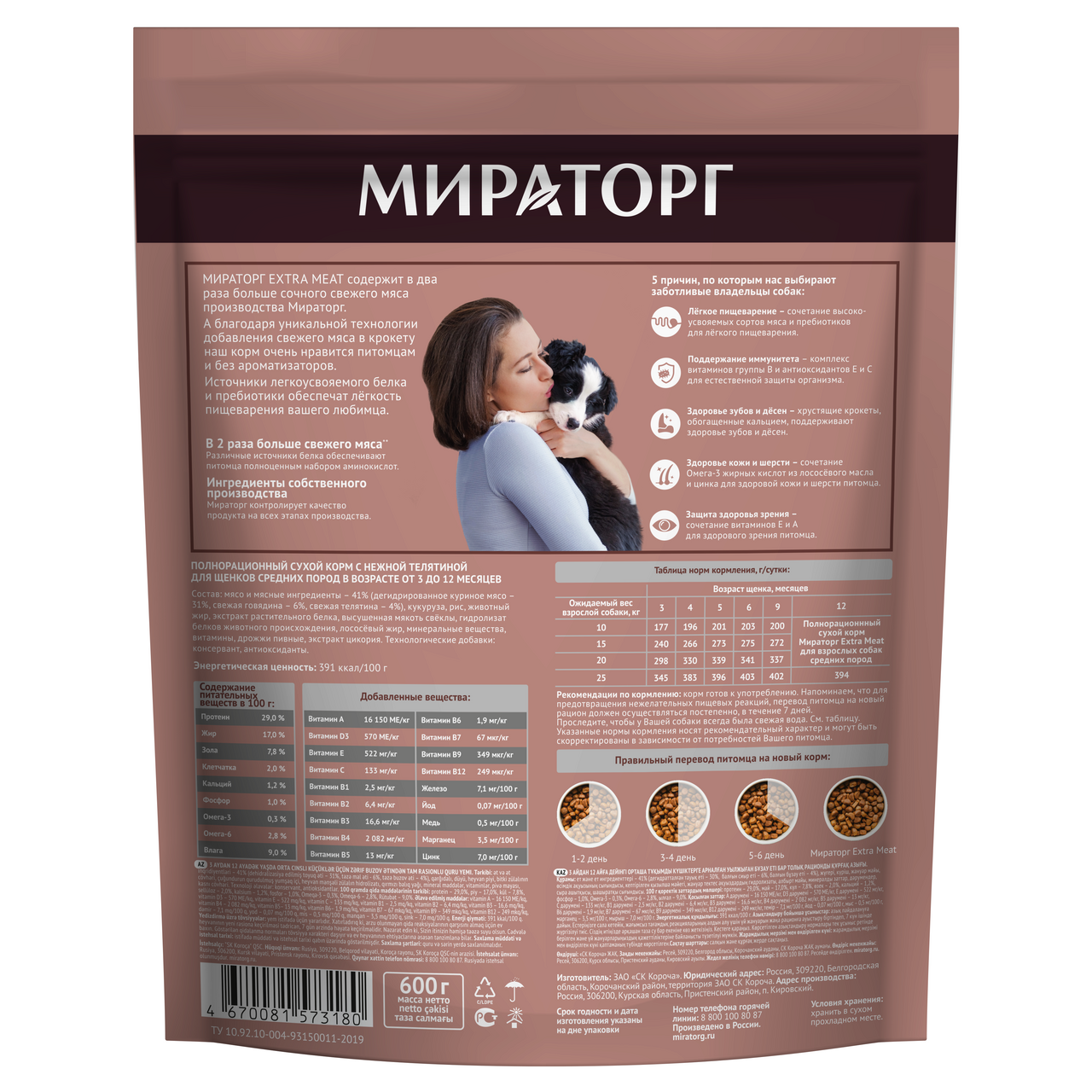 Корм сухой для щенков средних пород в возрасте от 3 до 12 мес. c нежной телятиной Extra Meat Мираторг 600г СК Короча (2505314)