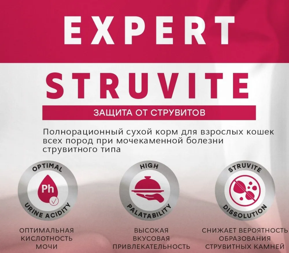Мираторг Expert - профессиональная линейка кормов, созданная на базе современных научных исследований в нутрициологии. Сбалансированные рационы Мираторг Expert помогают вашим питомцам поддерживать здоровье и жизненную энергию. Struvite – ветеринарная диета, для профилактики образования струвитных камней и мочекаменной болезни.