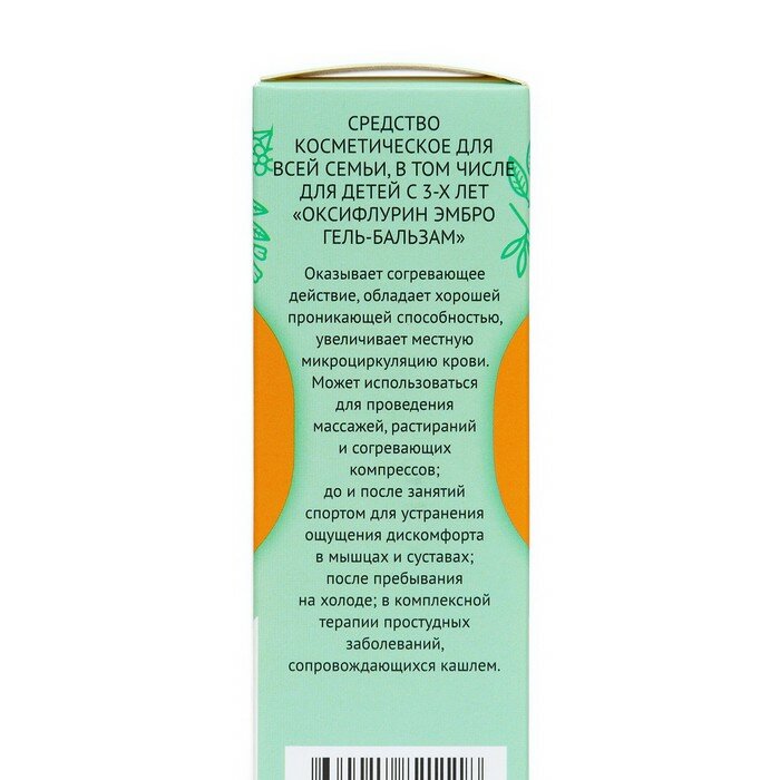 «ОКСИФЛУРИН ЭМБРО гель-бальзам» оказывает согревающее действие, обладает хорошей проникающей способностью, увеличивает местную микроциркуляцию крови. Может использоваться для проведения массажей, растираний и согревающих компрессов; до и после занятий спортом для устранения ощущения дискомфорта в мышцах и суставах; после пребывания на холоде. Эффективен в комплексной терапии простудных заболеваний, сопровождающихся кашлем. «ОКСИФЛУРИН ЭМБРО гель-бальзам» содержит барсучий жир, 6 эфирных масел, экстракт красного перца и камфору.Барсучий жир улучшает кровоток в месте нанесения, оказывает глубокое разогревающее воздействие, снимает напряжение, обладает тонизирующим действием.Эфирное масло эвкалипта угнетает жизнедеятельность болезнетворных бактерий, оказывает противовирусный эффект, способствует восстановлению кожи, устранению воспалительных процессов, сухости и шелушения.Эфирные масла сосны и пихты ? источники фитонцидов, содержат более 35 активных веществ, обладают противовоспалительным, бактерицидным и противовирусным действием, усиливают микроциркуляцию крови.Эфирное масло корицы активизирует обмен веществ, стимулирует кровообращение, оказывает антибактериальное и антивирусное действие.Эфирное масло мяты обладает выраженным противовоспалительным, антибактериальным, антисептическим и сосудорасширяющим эффектами.Эфирное масло чайного дерева обладает противовоспалительным и антисептическим действием.Экстракт красного перца обладает местно-согревающим действием, усиливает действие других компонентов.Камфора оказывает мягкое согревающее действие, обладает отличным увлажняющим и противовоспалительным действием.