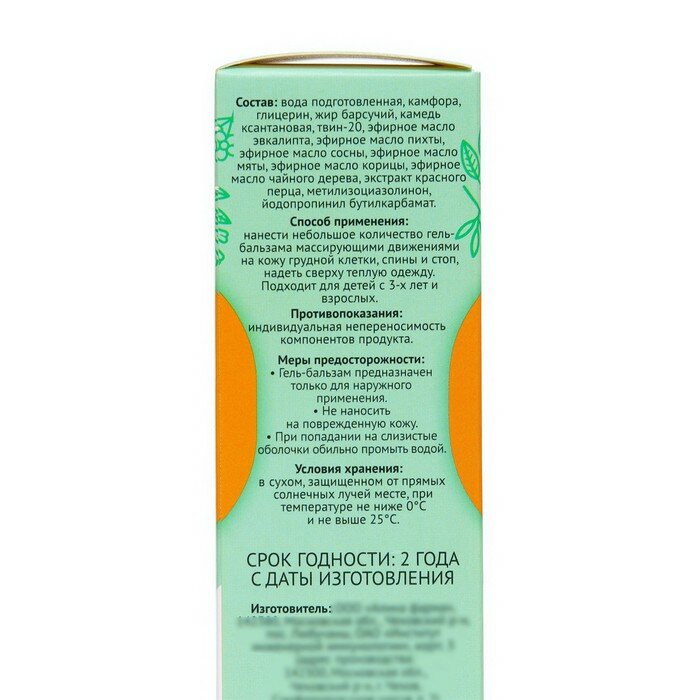 | Способ применения и дозы | Нанести небольшое количество гель-бальзама массирующими движениями на кожу грудной клетки, спины и стоп, надеть сверху теплую одежду. Подходит для детей с 3-х лет и взрослых. |