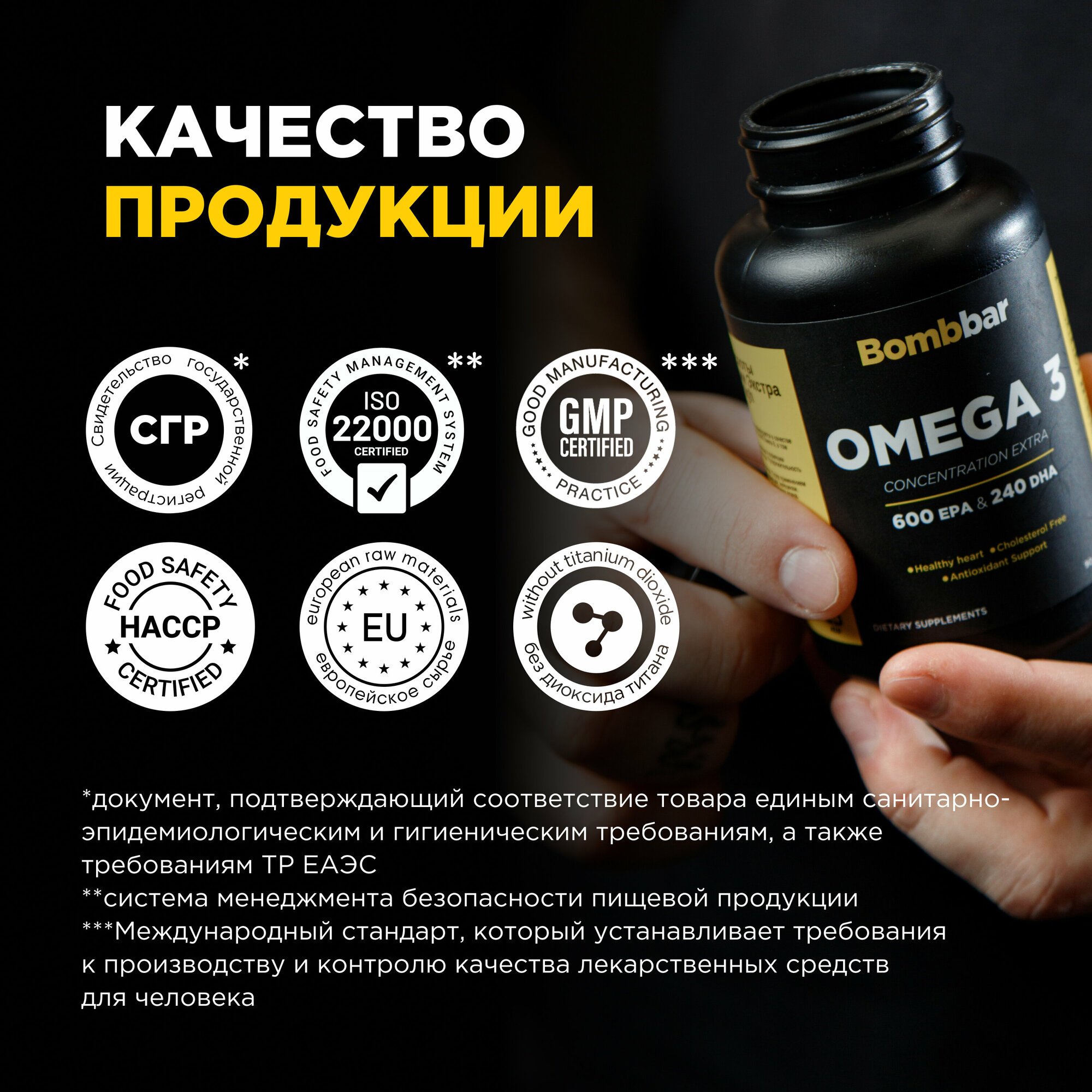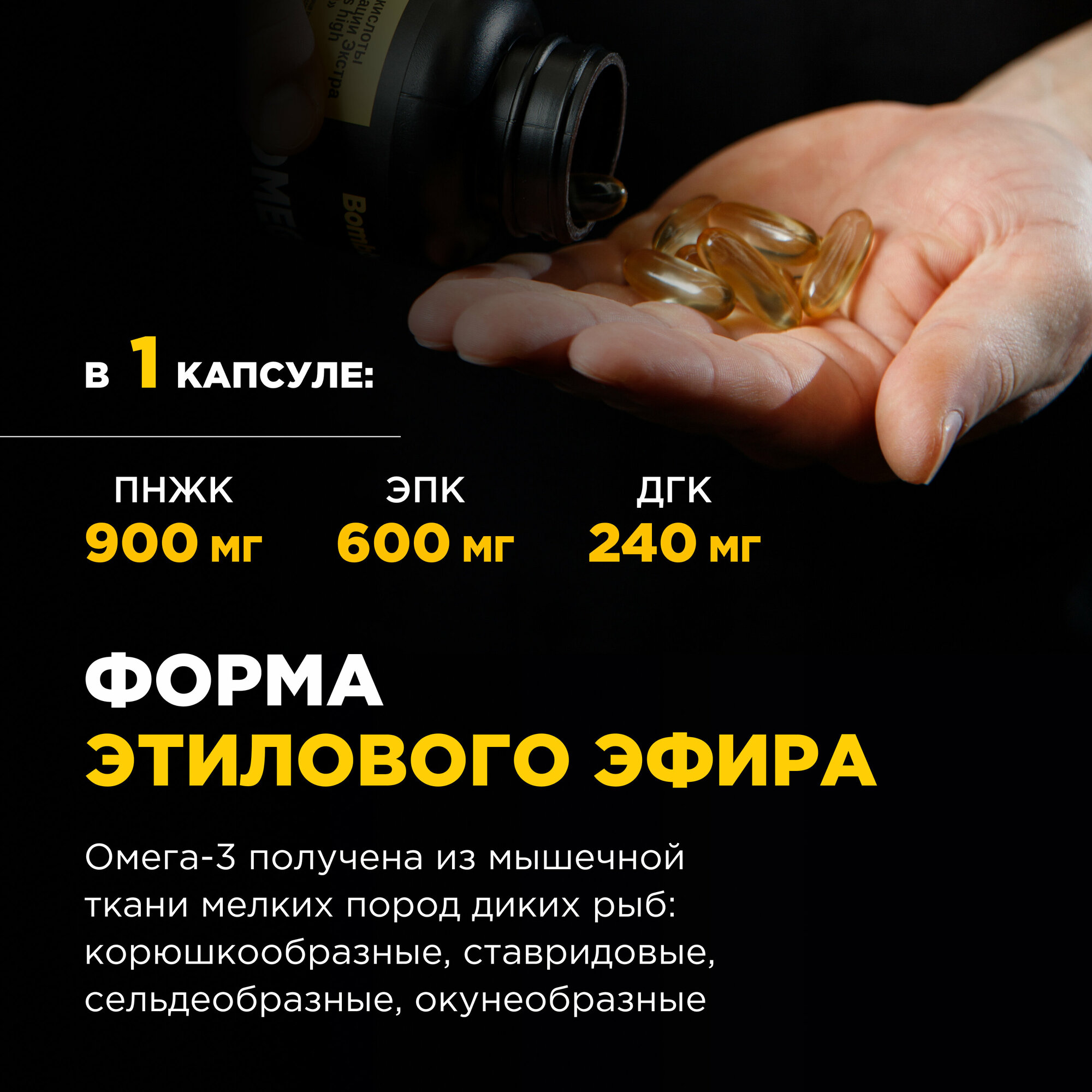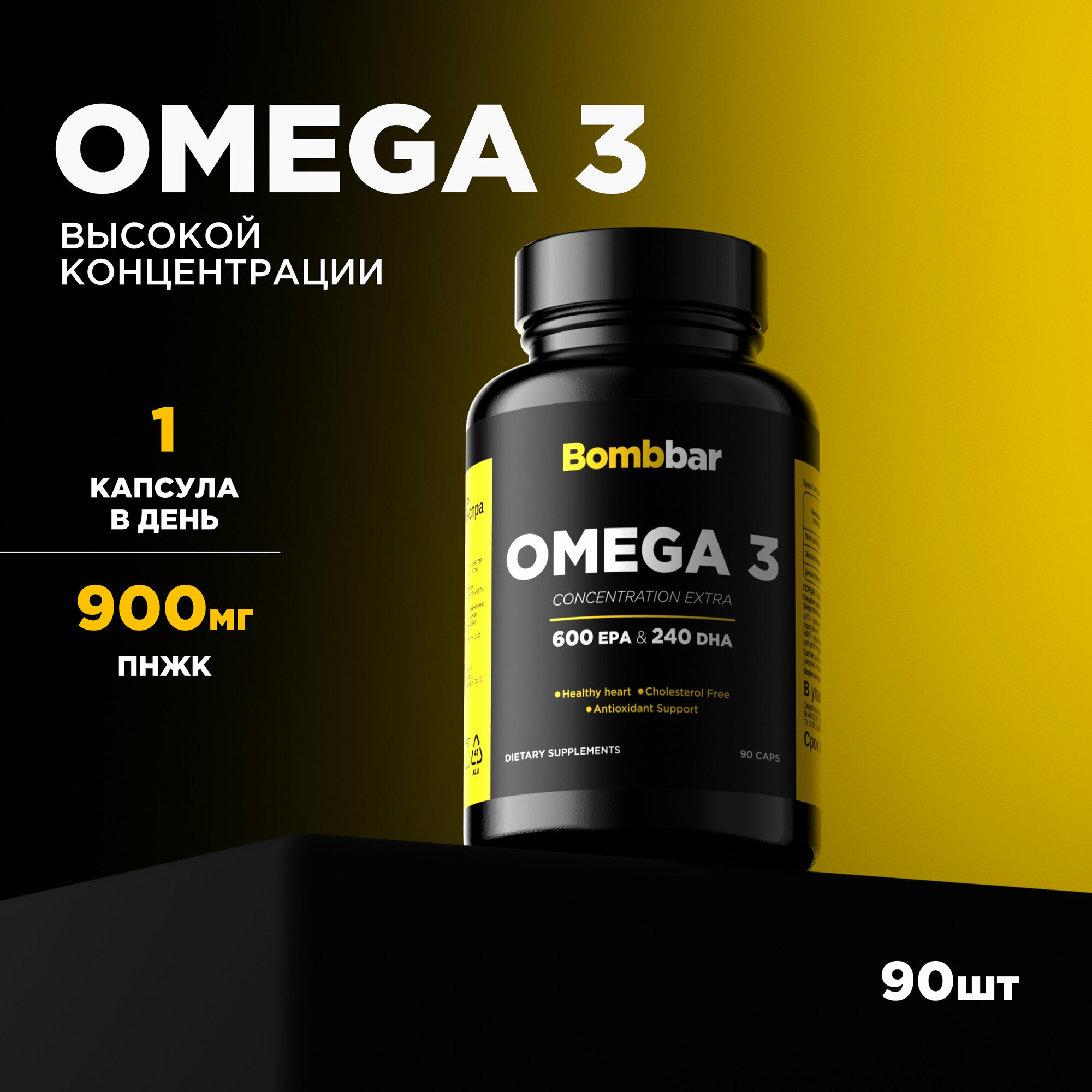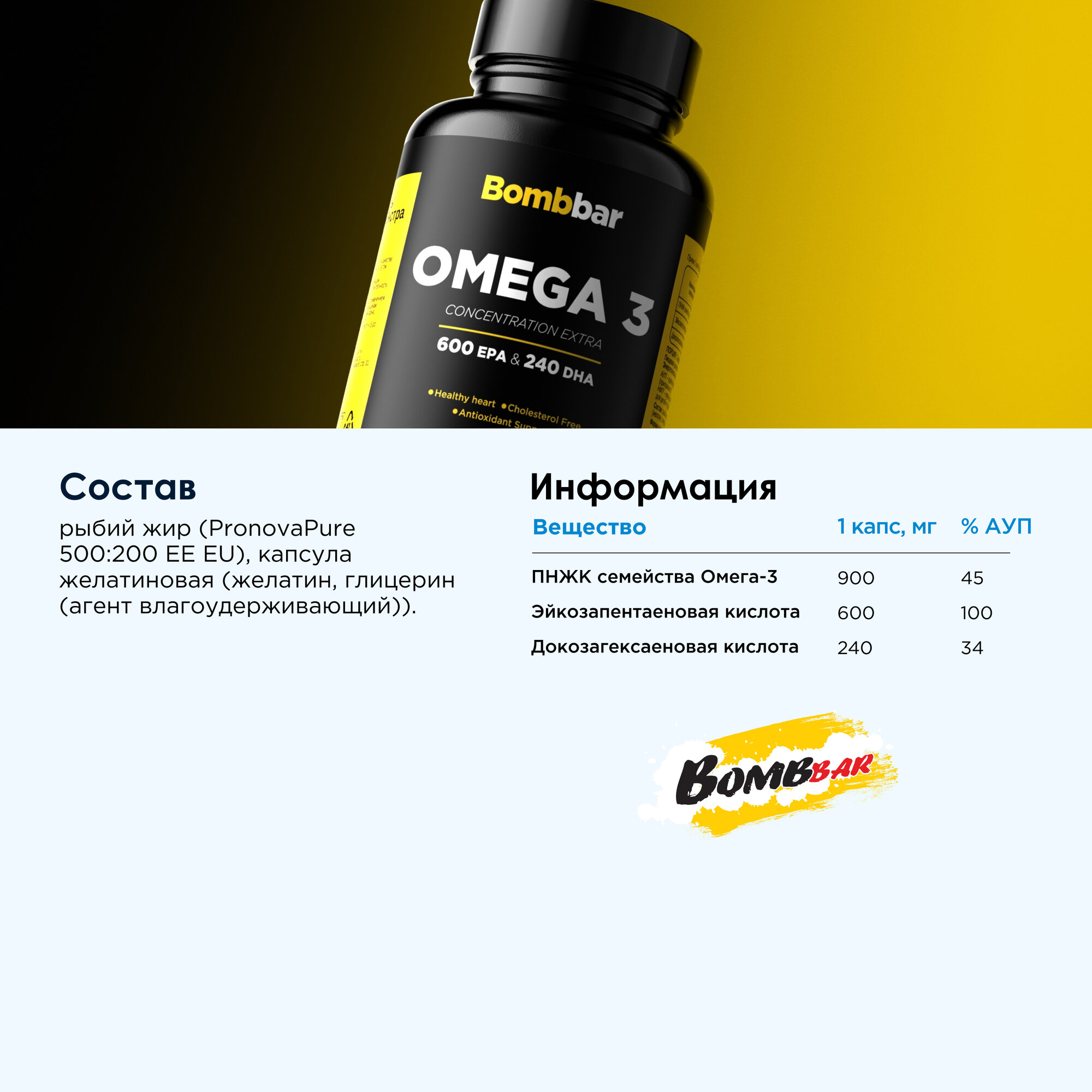Биологически активная добавка к пище: "Омега-3 жирные кислоты высокой концентрации Экстра". Форма выпуска: капсула массой 1620 мг.Способ применения и режим дозирования: взрослым и детям с 3-х лет по 1 капсуле в день во время еды. Продолжительность приема 1 месяц. Противопоказания: индивидуальная непереносимость компонентов. Перед применением рекомендуется проконсультироваться с врачом.Условия хранения: в недоступном для детей месте, при температуре от +15 ºС до +25 ºС и относительной влажности воздуха не более 60%.Срок годности: 2 года с даты изготовления.Новинка от Bombbar. Омега 3 капсулы. Omega 3 полиненасыщенные жирные кислоты входят в состав клеточных мембран и кровеносных сосудов, является одним из необходимых компонентов полноценного здорового питания. Основной источник рыбий жир или рыбный жир. Данный витаминный комплекс был разработан как витамины для женщин , для мужчин, витамины для подростков, витамины для иммунитета, аминокислоты комплекс. Так же в данной линейке помимо омега 3 6 9 представлены мультивитамины, витамин д3, селен , витамин а, витамины для волос и ногтей. Правильное питание и пп еда для похудения, для спорта, диетические продукты способствуют омега-3 правильной работе организма. Подходит омега 3 взрослым и детям. Прекрасный подарок для парня, спортпит для девушек. Омега3 от Bombbar) Будьте здоровы.