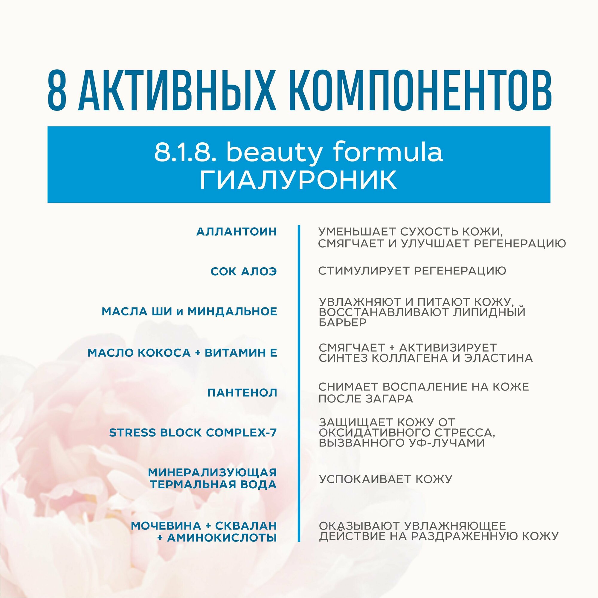 Увлажняющее восстанавливающее средство после воздействия солнечных лучей.О товаре8.1.8 BEAUTY FORMULA - трехфазная система профилактики и защиты кожи от стресса. Создана для чувствительной кожи женщин мегаполиса, испытывающих дефицит сна и отдыха. Снимает покраснения и отечность после воздействия солнечных лучей. Восстанавливает и увлажняет кожу. МИНЕРАЛИЗУЮЩАЯ ТЕРМАЛЬНАЯ ВОДА успокаивает кожу. STRESS BLOCK COMPLEX-7 на основе экстракта цветков вишни защищает кожу от оксидативного стресса, вызванного УФ-излучением. МАСЛО КОКОСА увлажняет и питает кожу. Участвует в восстановлении липидного барьера. ВИТАМИН Е снижает разрушительное действие ультрафиолета на чувствительную кожу. Активизирует синтез коллагена и эластина в коже. АЛЛАНТОИН уменьшает сухость кожи, смягчает и улучшает регенерацию. ПАНТЕНОЛ снимает воспаление. Предотвращает появление покраснений и раздражения на коже после загара. СОК АЛОЭ стимулирует регенерацию. Оказывает противовоспалительное действие. МАСЛА ШИ и МИНДАЛЬНОЕ увлажняют и питают кожу. Восстанавливают липидный барьер. МОЧЕВИНА увлажняет кожу, в том числе глубокие слои эпидермиса. СКВАЛАН и АМИНОКИСЛОТЫ оказывают увлажняющее действие на раздраженную кожу. Способ применения:Встряхнуть флакон перед применением. Регулярно наносить на кожу лица и тела после солнечных ванн. Равномерно распылить средство на кожу с расстояния 30-40 см, оставить до полного впитывания. Состав:Aqua, Prunus Amygdalus Dulcis (Sweet Almond) Oil, Glycerin, Glyceryl Stearate, Ceteareth-20, Ceteareth-12, Cetearyl Alcohol, Cetyl Palmitate, Butyrospermum Parkii (Shea) Butter, Betaine, Prunus Cerasus (Bitter Cherry) Flower Extract, Aloe Barbadensis Leaf Juice, Squalane, Panthenol, Sodium Pca, Glucose, Urea, Glutamic Acid, Lysine, Glycine, Allantoin, Lactic Acid, Potassium Sorbate, Sodium Benzoate, Gluconolactone, Calcium Gluconate, Butylene Glycol, Acetyl Tyrosine, Proline, Hydrolyzed Vegetable Protein, Adenosine Triphosphate, Inulin, Alpha-Glucan Oligosaccharide, Thermal Water, Ethylhexylglycerin, Benzyl Alcohol, Tocopheryl Acetate, Caprylic/Capric Triglyceride, Cocos Nucifera (Coconut) Oil, Acrylates/C10-30 Alkyl Acrylate Crosspolymer, Xanthan Gum, Cyclopentasiloxane, Dimethiconol, Parfum, Sodium Hydroxide.