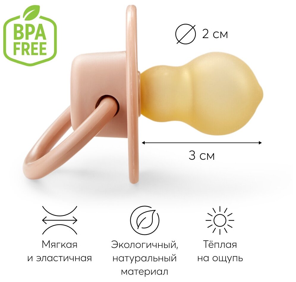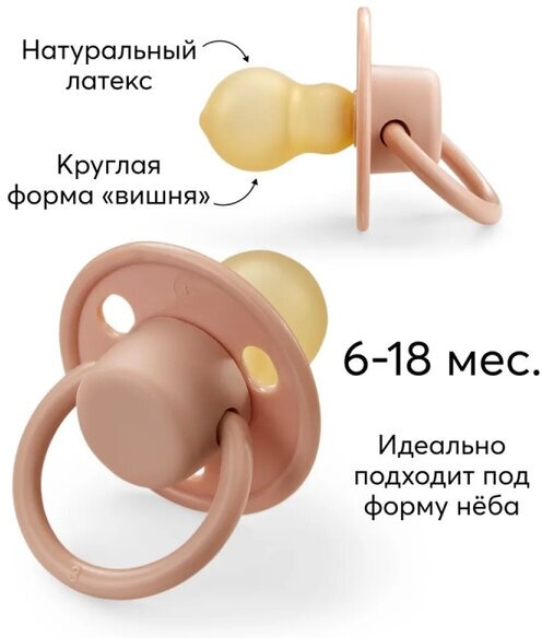 Латексная соска-пустышка изготовлена из природного материала, не вызывающего аллергических реакций и рекомендована для использования от 12 до 24 месяцев. Круглая форма соски успокаивает малыша и прекрасно удовлетворяет сосательный рефлекс, помогая ослабить неприятные ощущения во время прорезывания зубов.