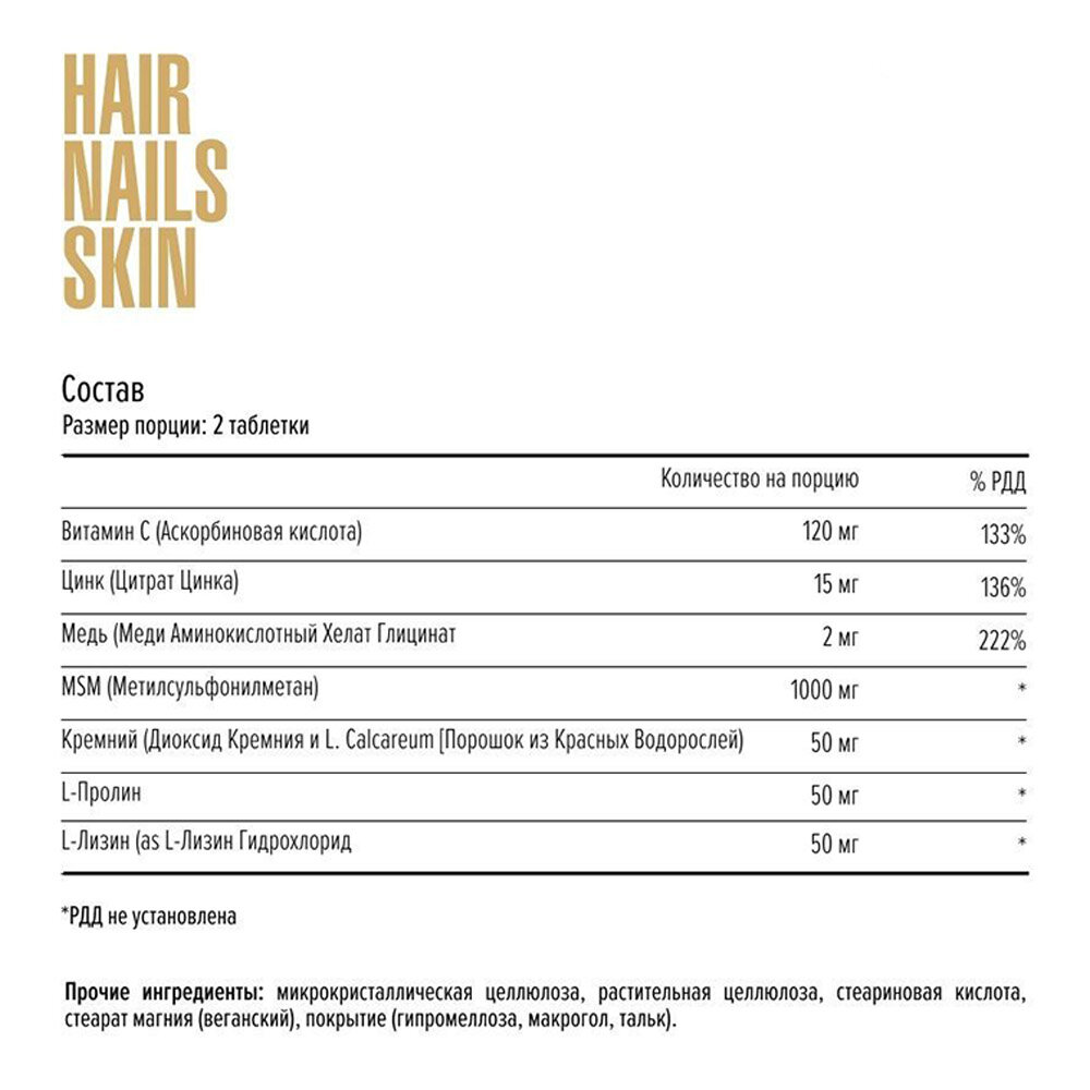 Каждый день требуется прилагать все больше усилий, чтобы справляться с повседневными делами и хлопотами. Не всегда остается ресурс поддержать свою красоту. Конечно, не существует таблетки, которая могла бы чудесным образом гарантировать вам вечную молодость и красоту без лишних усилий. Красота требует упорной работы, начиная от обеспечения достаточного количества сна до физических упражнений и большого количества питательных веществ. Можно помочь организму сохранить красоту, обеспечив его необходимыми веществами. Поскольку кожа, ногти и волосы состоят из структурного белка - коллагена, важно обеспечить организм питательными веществами, необходимыми для производства этой молекулы. Как работает эта формула? Коллаген производится клетками с помощью аминокислот. К ним относятся пролин, лизин и глицин. Эти аминокислоты нуждаются в помощи витамина С. Этот витамин помогает превратить пролин в форму, которая может быть использована клетками для производства коллагена. Наряду с этим, коллагену необходимы минералы цинк и медь. Цинк играет ключевую роль во многих реакциях, происходящих в организме. Цинк используется ферментом коллагеназой, который помогает расщеплять неиспользуемый или поврежденный коллаген. Медь помогает молекулам коллагена соединяться, образуя ткани. Чтобы помочь вашим клеткам вырабатывать коллаген, все эти ингредиенты включены в состав данной формулы. Наряду с ними в состав препарата входят кремний и МСМ. Кремний также может способствовать выработке коллагена, но его польза заключается еще и в том, что он помогает сохранить влагу в коже. MSM - это органическая форма серы. Она помогает сохранить эластичность кожи, сохраняет коллаген и защищает кожу от стрессов, вызывающих старение. Maxler Hair Nails Skin станет вашим основным средством для поддержания здоровья и молодости кожи, волос и ногтей. Эти веганские таблетки - удобный способ получить самые важные минералы и аминокислоты. Сияйте вместе с Maxler! Рекомендации по применению: в качестве диетической добавки, принимайте 2 таблетки 1 раз в день, желательно во время еды.