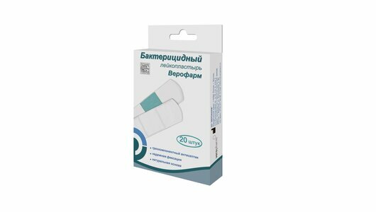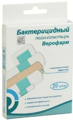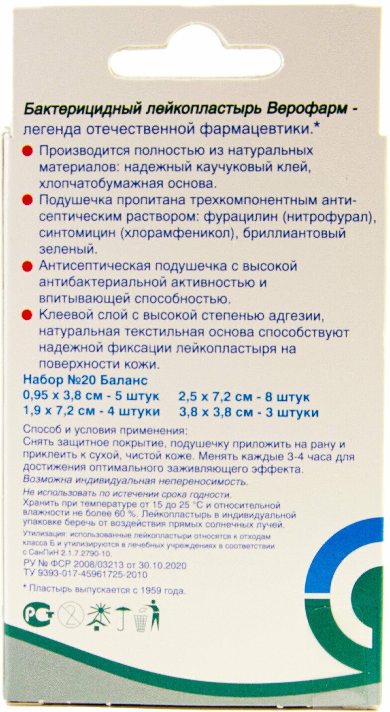 Бактерицидный лейкопластырь Верофарм- легенда отечественной фармацевтики.Производится полностью из натуральных материалов: надежный каучуковый клей, хлопчатобумажная основа.Подушечка пропитана трехкомпонентным антисептическим раствором: фурацилин (нитрофурал), синтомицин (хлорамфеникол), бриллиантовый зеленый.Антисептическая подушечка с высокой антибактериальной активностью и впитывающей способностью.Клеевой слой с высокой степенью адгезии, натуральная текстильная основа способствует надежной фиксации лейкопластыря на поверхности кожи.Способ и условия применения: снять защитное покрытие, подушечку приложить на рану и приклеить к сухой, чистой коже. Менять каждые 3–4 часа для достижения оптимального заживляющего эффекта.Набор № 20:0,95 х 3,8 см – 5 шт.1,9 х 7,2 см – 4 шт.2,5 х 7,2 см – 8 шт.3,8 х 3,8 см – 3 шт Предназначен для использования в качестве наружного антисептического перевязочного средства при небольших порезах, ссадинах, царапинах и других мелких повреждениях кожи.