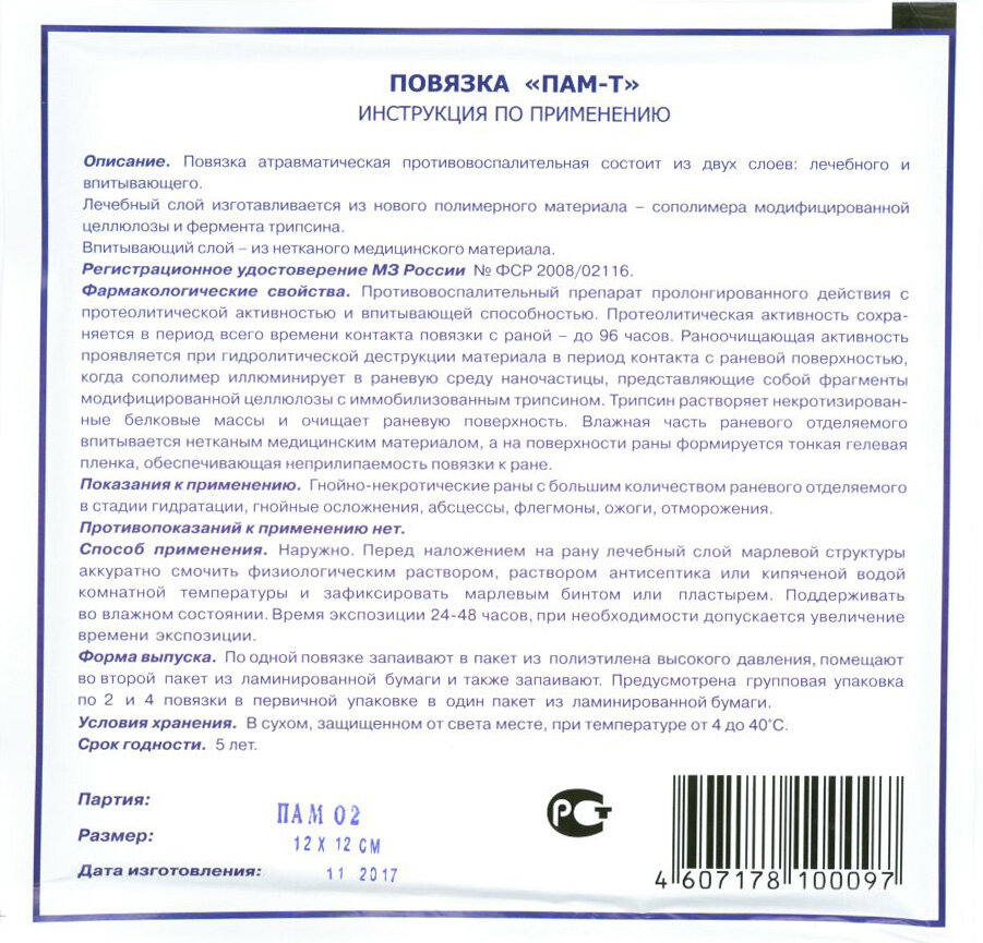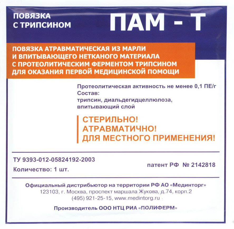 Повязка с трипсином ПАМ-Т обладает выраженным протеолитическим очищающим эффектом, для чего имеет толстый впитывающий слой для лечения гнойных пролежней с большим количеством отделяемого. Быстро и безболезненно очищает раны от гноя и некроза.