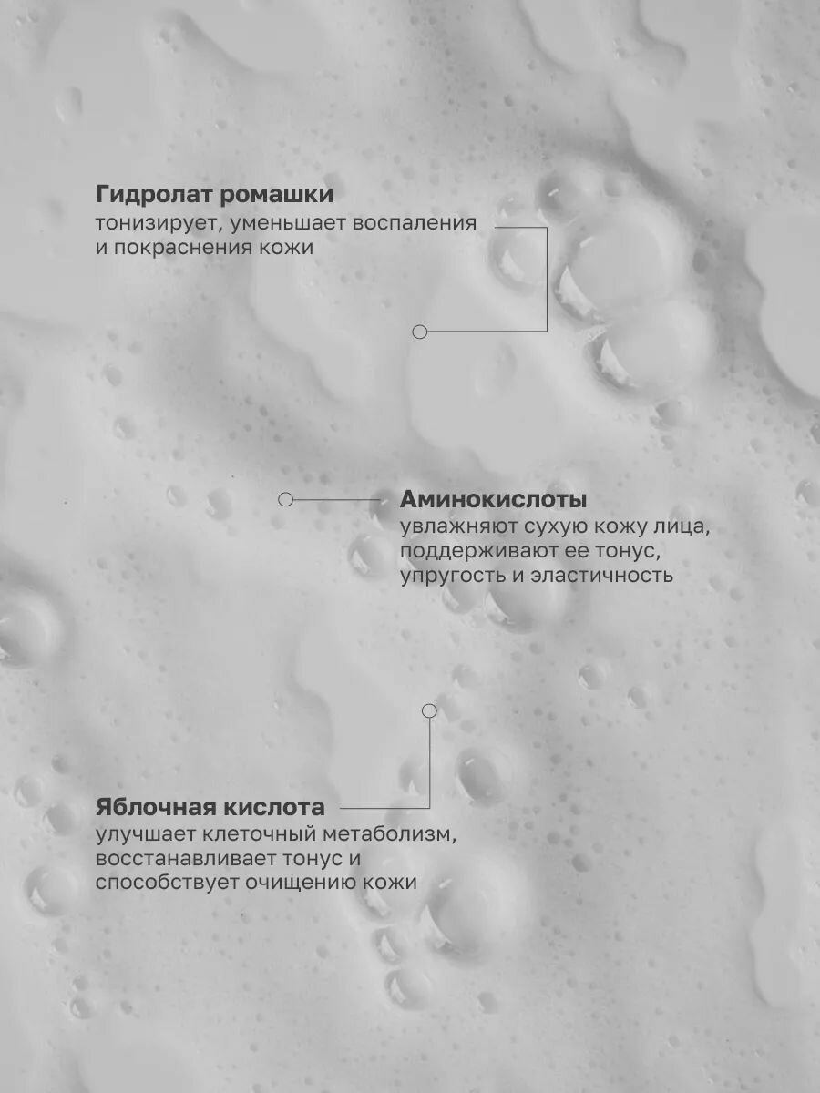Мягкая очищающая пенка на основе натуральных растительных ингредиентов нежно успокаивает кожу, устраняя раздражения и высыпания. Подходит даже для самой нежной и чувствительной кожи. Гидролат ромашки успокаивает кожу, сужает поры и снимает отечность, в свою очередь аминокислоты борются с первыми признаками старения на лице.