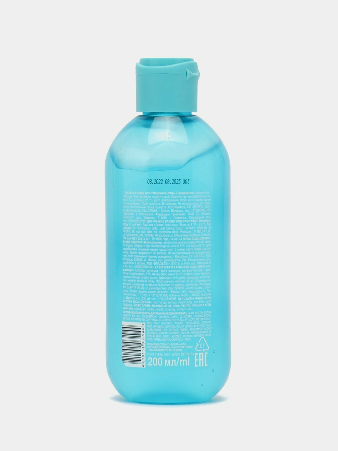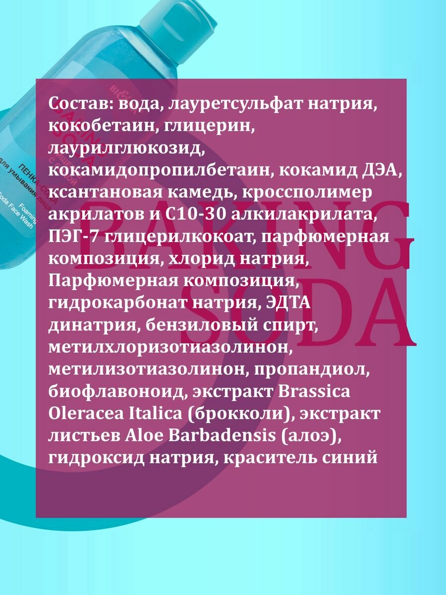 | Состав | вода, лауретсульфат натрия, кокобетаин, глицерин, лаурилглюкозид, кокамидопропилбетаин, кокамид ДЭА, ксантановая камедь, кроссполимер акрилатов и C10-30 алкилакрилата, ПЭГ-7 глицерилкокоат, парфюмерная композиция, хлорид натрия, Парфюмерная композиция, гидрокарбонат натрия, ЭДТА динатрия, бензиловый спирт, метилхлоризотиазолинон, метилизотиазолинон, пропандиол, биофлавоноид, экстракт Brassica Oleracea Italica (брокколи), экстракт листьев Aloe Barbadensis (алоэ), гидроксид натрия, краситель синий |