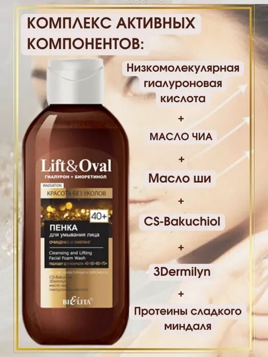 Пенка для умывания лица “Очищение и лифтинг” Lift&Oval 40+Нежная пенка для ежедневного умывания тщательно очищает кожу от загрязнений, не нарушая естественный защитный барьер. Комплекс активных компонентов (CS-Bakuchiol, 3Dermilyn, Масла чиа и ши, Низкомолекулярная гиалуроновая кислота, Протеины сладкого миндаля): мягко и эффективно очищаетпредупреждает преждевременное старениеподходит для частого использованияCS-Bakuchiol уменьшает гиперпигментацию, выравнивает тон, устраняет несовершенства кожи, а также обладает противовоспалительным действием.3DERMILYN предотвращает преждевременное старение, ремоделирует овал лица и подтягивает кожу. Масло чиа, благодаря фантастическому жирнокислотному составу омолаживает, подтягивает и увлажняет увядающую кожу. Масло ши питает и увлажняет кожу, повышает ее упругость, способствуя регенерации клеток кожи. Низкомолекулярная гиалуроновая кислота стимулирует выработку собственной гиалуроновой кислоты, обеспечивает видимый эффект лифтинга, уменьшает глубину морщин и шероховатость кожи. Протеины сладкого миндаля способны укреплять защитные функции эпидермиса, питают, смягчают, увлажняют кожу и уменьшают проявление сосудистого рисунка.