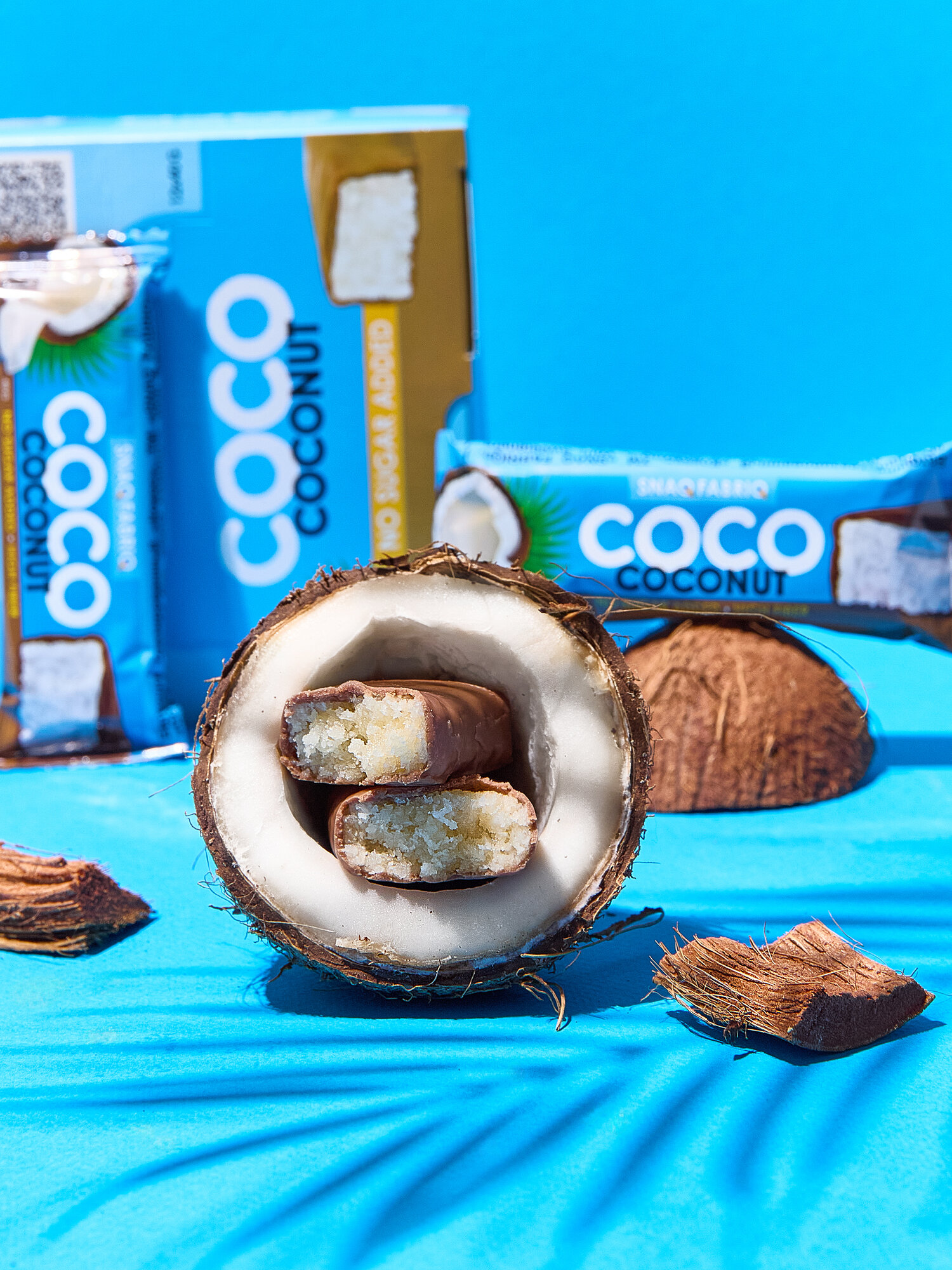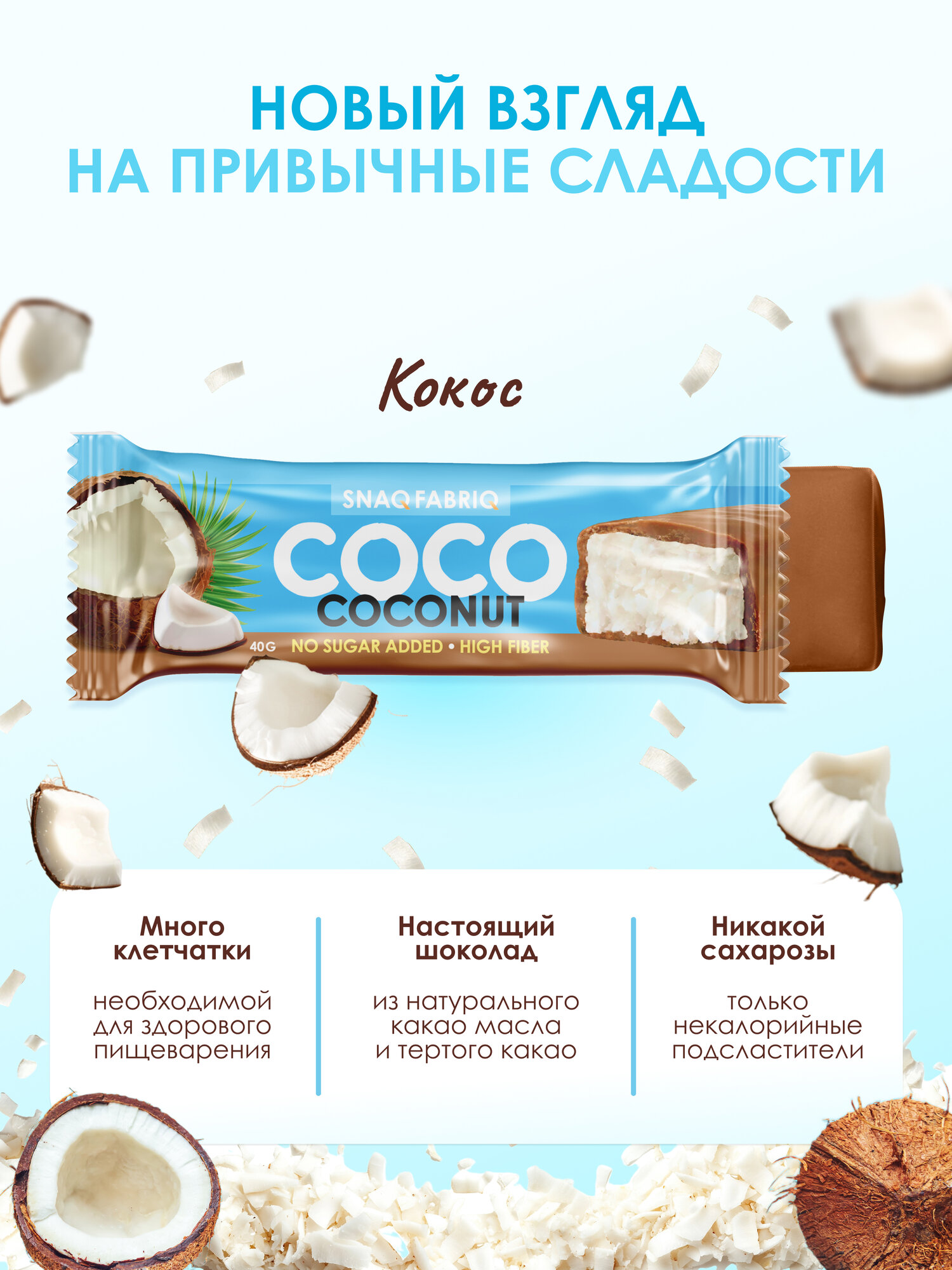 Батончик с начинкой из нежной мякоти кокоса, покрытый ароматным натуральным молочным шоколадом без сахара.