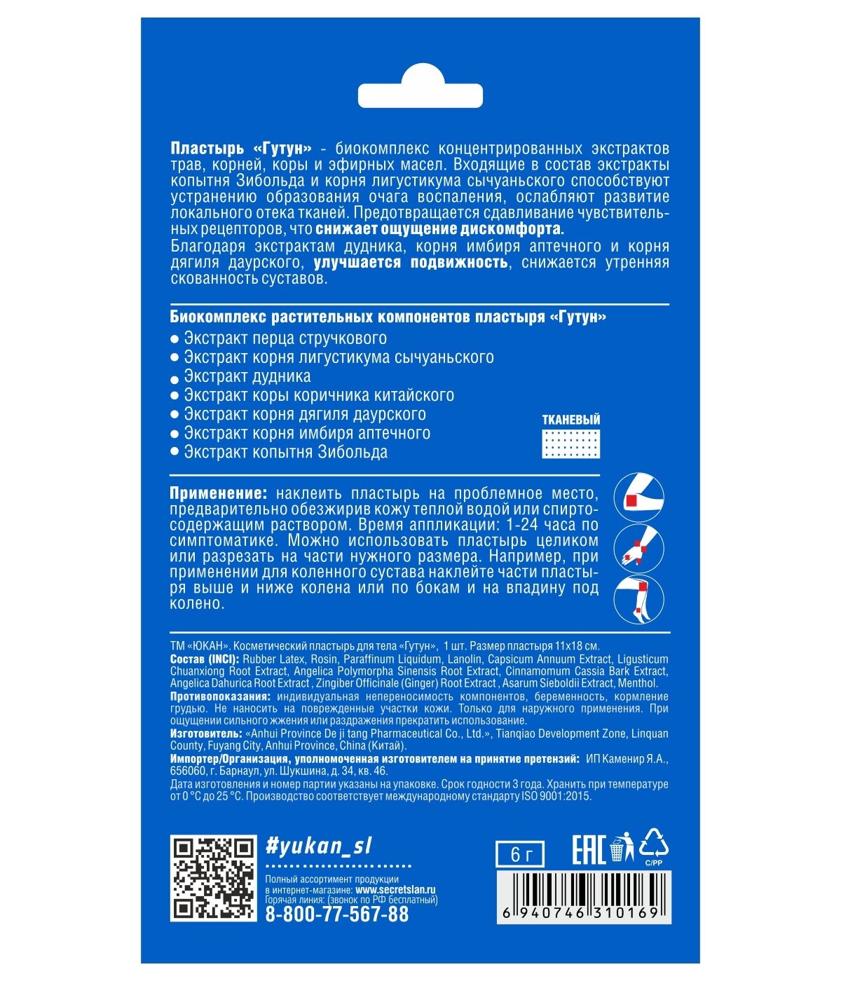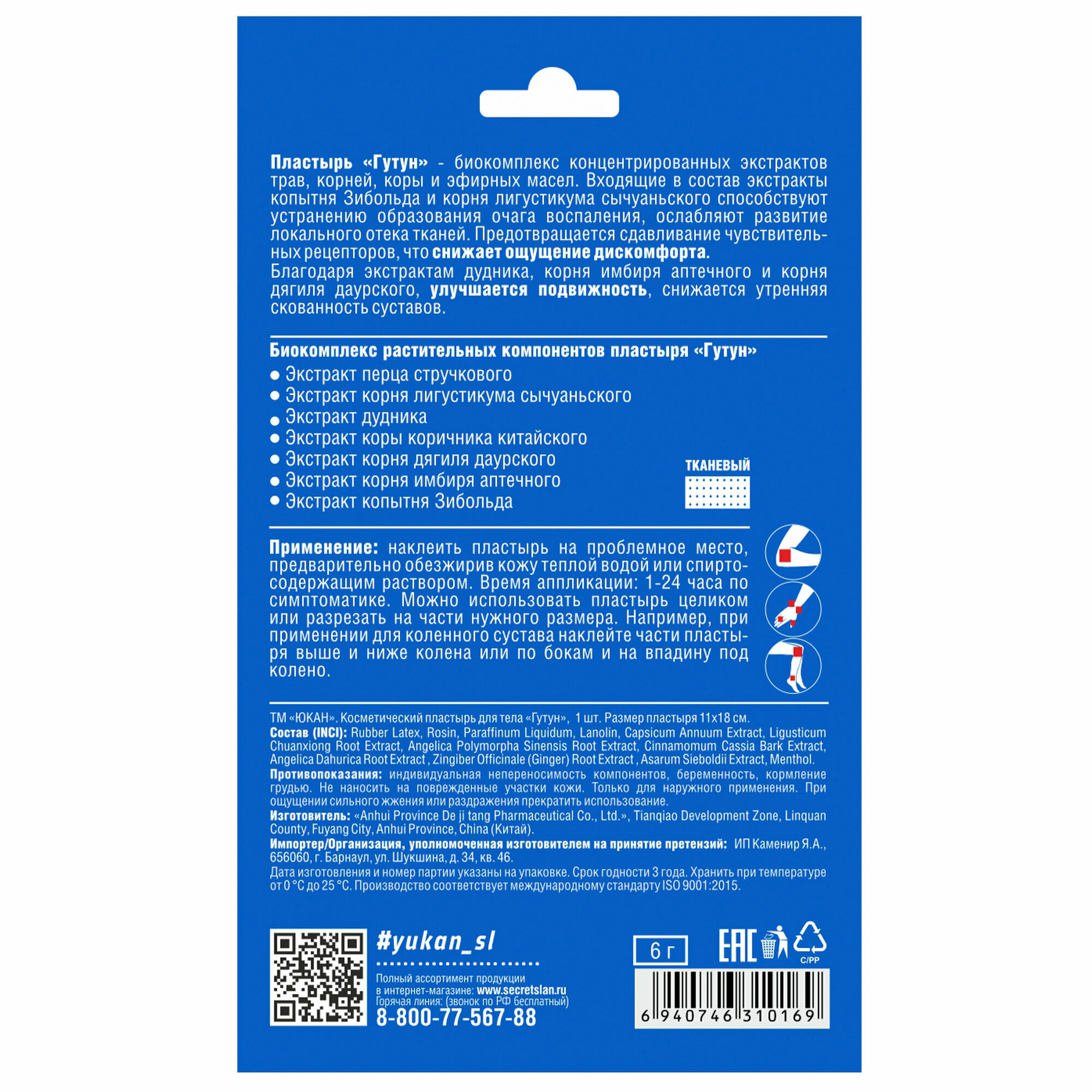 Чаще всего боль в суставах возникает из-за застоя крови в организме в определенных частях тела. Связки и мышцы не получают необходимого питания через кровь и вокруг сустава возникает воспаление, которое ограничивает его подвижность и вызывает болевые ощущения.Улучшении кровообращения с помощью обезболивающего пластыря для суставов "Гутун". Это комплекс концентрированных экстрактов трав, корней, коры и эфирных масел. Обезболивающие свойства обеспечивают экстракты копытня Зибольда и корневища лигустикума сычуаньского. Угнетение образования очага воспаления ослабляет развитие локального отека тканей, вследствие чего предотвращается сдавливание чувствительных рецепторов и нервных проводников, что снижает ощущение боли.Улучшение подвижности достигается благодаря экстрактам дудника китайского, корня имбиря аптечного и корня дягиля даурского, которые уменьшают утреннюю скованность и отек суставов, способствуют увеличению объема движений и рекомендуются при артритах, артрозах, остеоартрозах, бурситах, ревматизме.Местный согревающий и раздражающий эффект камфары и экстракта перца стручкового влияет на расширение сосудов и улучшение локального кровообращения, что способствует питанию (трофики) тканей и ускорению восстановительных процессов.ПоказанияПри «болевом синдроме», сопровождающимся застоем крови и закупоркой кровяных сосудов;При параличе, отеках и ограничениях подвижности суставов, потере гибкости; При дегенеративных артритах и поражениях костной ткани; При отложении солей;Снимает отеки, не только обезболивает, но и восстанавливает двигательную активность суставов.ПротивопоказанияНе является лекарственным средством;Возможна индивидуальная непереносимость компонентов;Беременность, кормление грудью;Не наносить на поврежденные участки кожи.Способ примененияНаклеить пластырь на проблемное место, предварительно обезжирив кожу теплой водой или спиртосодержащим раствором. Время аппликации: 1-12 часов по симптоматике. Можно использовать пластырь целиком или разрезать на части нужного размера.СоставRubber Latex, Rosin, Paraffinum Liquidum, Lanolin, Capsicum Annuum Extract (экстракт перца стручкового), Ligusticum Chuanxiong Root Extract (экстракт корня лигустикума сычуаньского), Angelica Polymorpha Sinensis Root Extract (экстракт дудника), Cinnamomum Cassia Bark Extract (экстракт коры коричника китайского), Angelica Dahurica Root Extract (экстракт корня дягиля даурского), Zingiber Officinale (Ginger) Root Extract (экстракт корня имбиря аптечного), Asarum Sieboldii Extract (экстракт копытня Зибольда), Menthol (производное мятного эфирного масла).