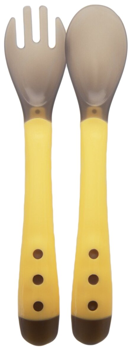 Детская посуда «Курносики» производится из прочных безопасных материалов и проходит тщательный контроль качества. В набор входят термочувствительные ложечка и вилочка, а также футляр для хранения. Термочувствительные части приборов - ковш у ложки, зубчики у вилки - изменяют цвет, если температура пищи превышает 40 °С. Удобный футляр позволяет брать приборы с собой в поездку. Уход: мыть горячей водой с мылом, тщательно ополаскивать. Перед первым использованием необходимо тщательно вымыть. Не кипятить! Срок службы: 6 месяцев