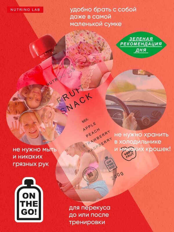 Пюре NUTRINO LAB Яблоко, персик, клубника, малина, с 3-х лет, 200 гр. (пауч)Без особых усилий обеспечьте себя полезным перекусом. Замените мытье, измельчение и смешивание ваших любимых фруктов натуральным пюре Nutrino Lab из яблока, персика, клубники и малины и наслаждайтесь! Фрукты и ягоды - доступные круглый год. Состав: концентрированное яблочное пюре 69%, концентрированное персиковое пюре 19%, клубничное пюре 6%, концентрированное пюре малины 6%Современные и функциональные фруктовые пюре для здорового перекуса «Nutrino Lab» стали лауреатами двух премий «Здоровое питание» 2022 года. Организаторы и эксперты премии «Здоровое питание» 2022 года отметили новое направление в здоровом питании «Nutrino Lab», присудив ему победу в номинации «Лучшая торговая марка» в категории «Фруктовое пюре». Исследовательский холдинг Ромир в составе экспертного совета Премии «Здоровое питание 2022» на основании выбора потребителей наградил фруктовые пюре «Nutrino Lab» в номинации «Выбор потребителей 2022». Продукт может быть использован в питании людей ведущих здоровый образ жизни, а также с особенностями в состоянии здоровья, которые требуют ограничения приема продуктов с добавленными сахарами. Российская Диабетическая Ассоциация рекомендует фруктовые пюре «Nutrino Lab» для ведения здорового образа жизни и для питания потребителей с сахарным диабетом.