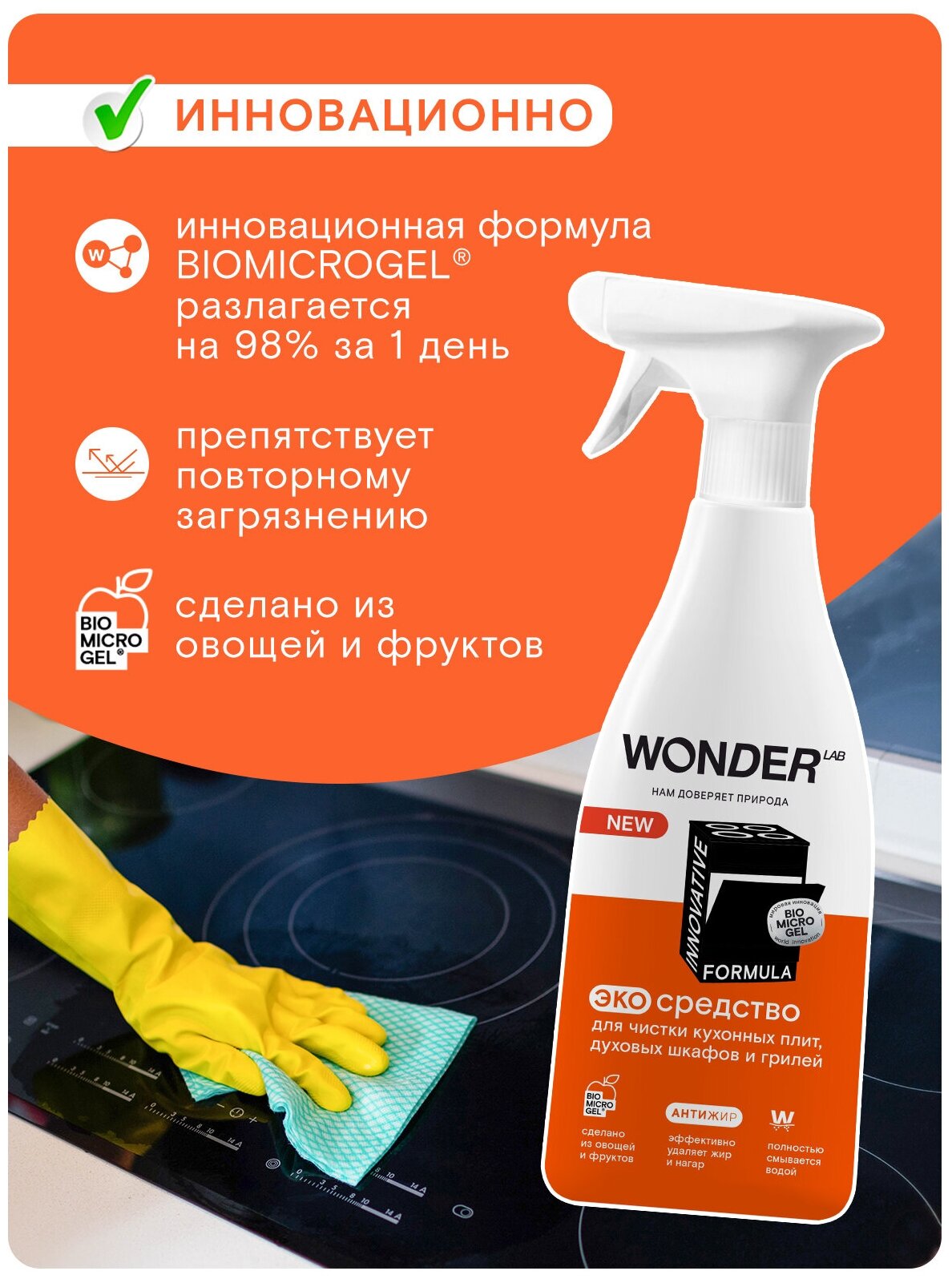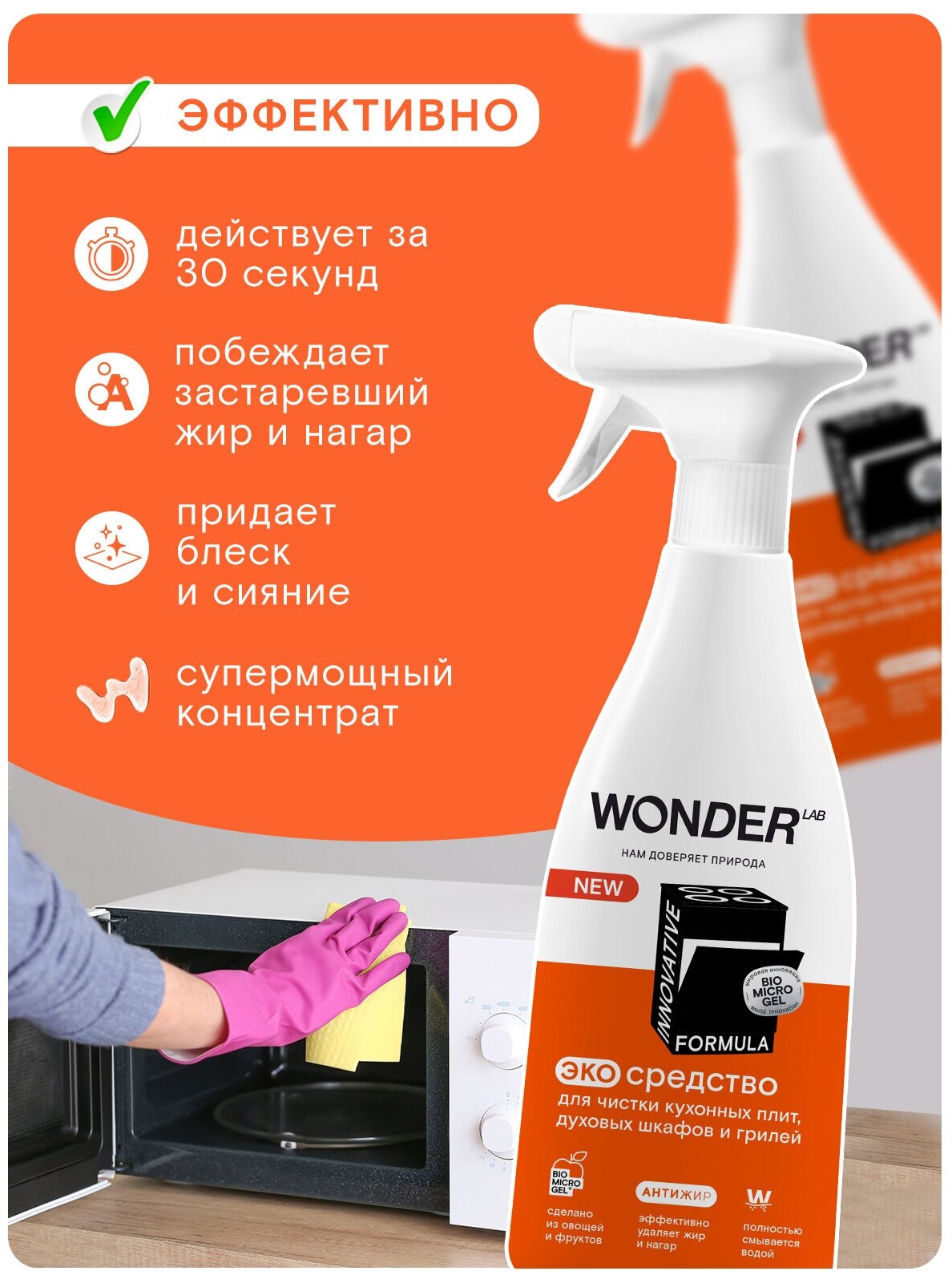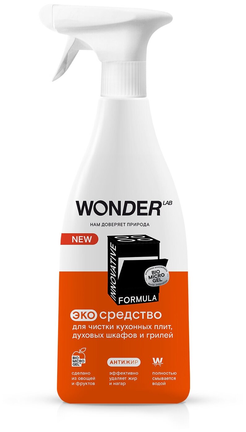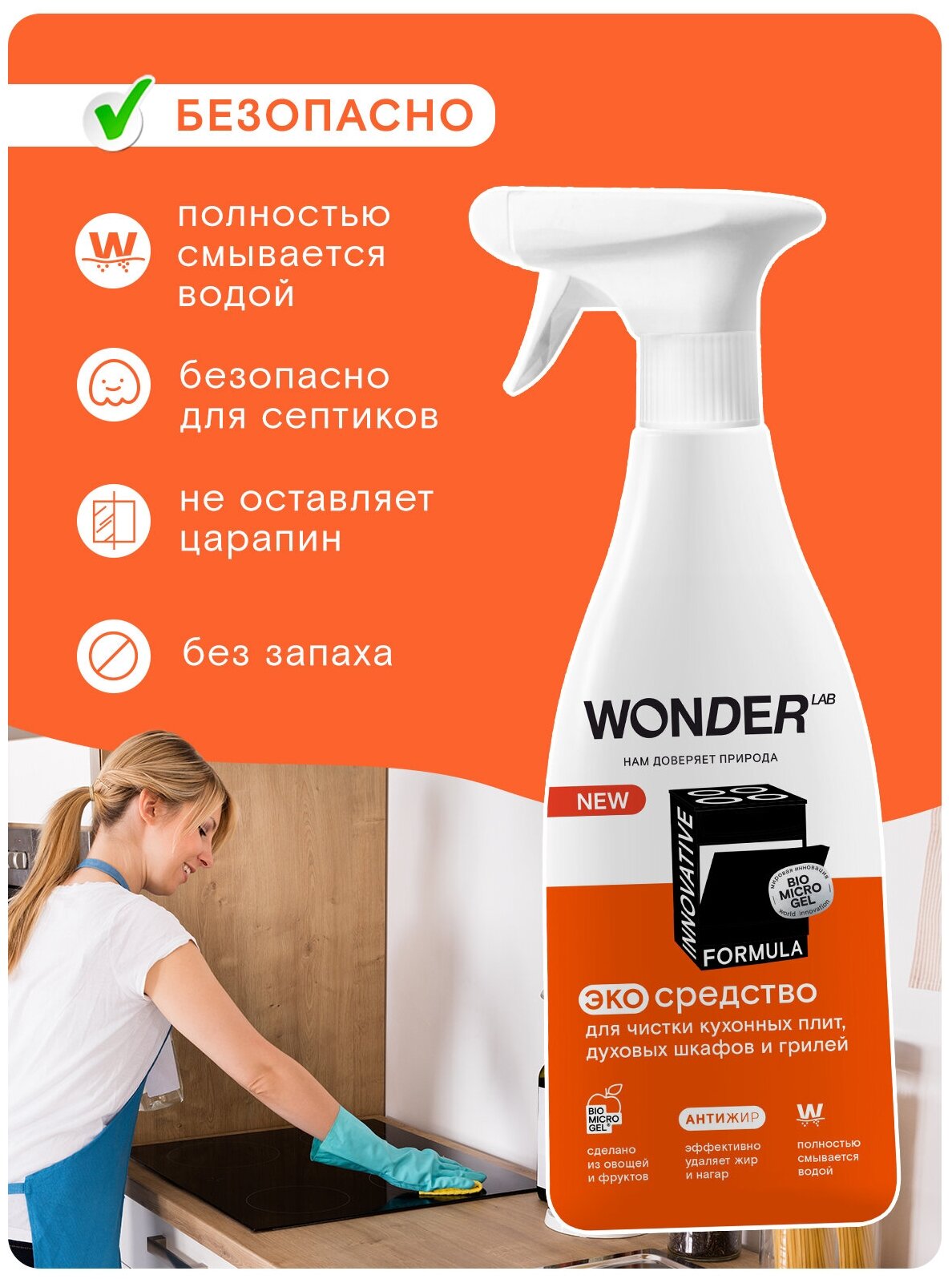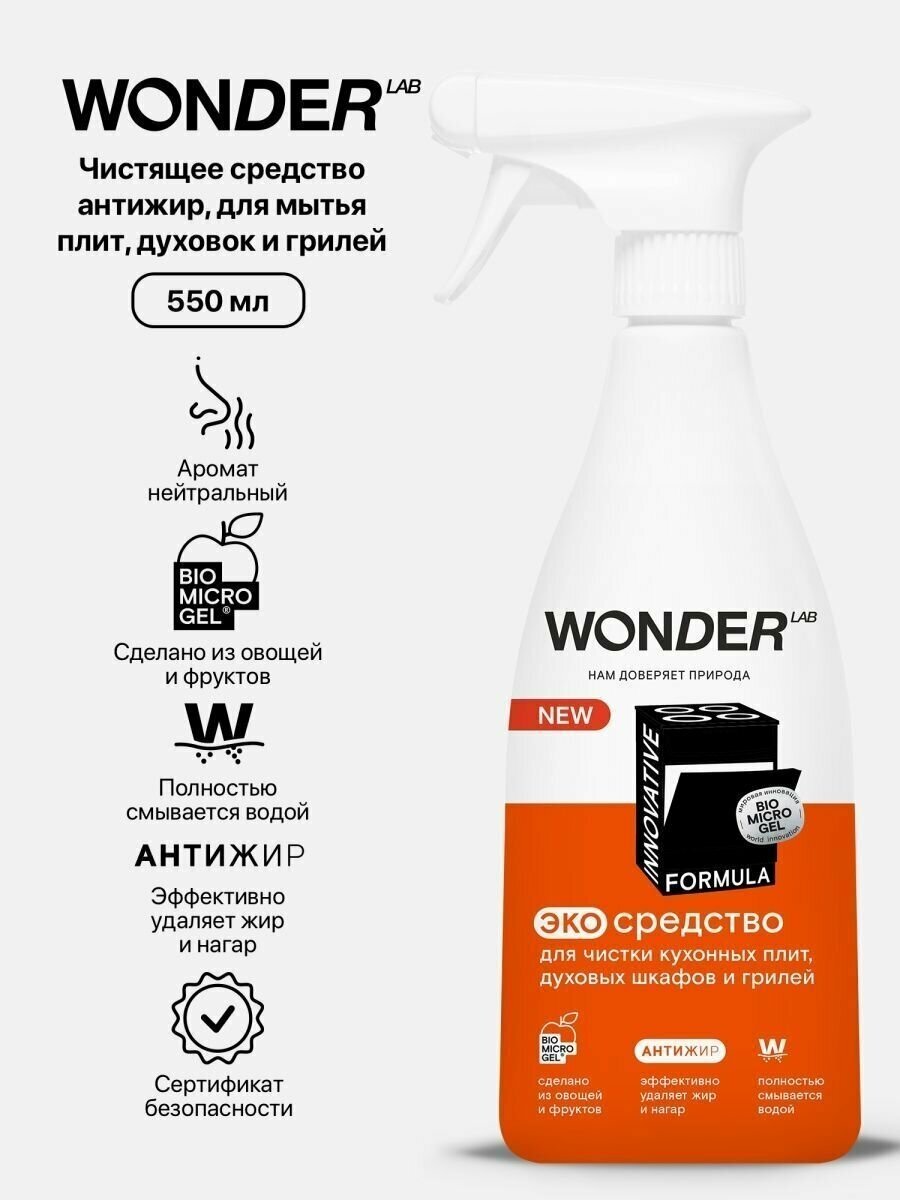 Антижир WONDER LAB - мощное средство для удаления самых застаревших пятен жира, копоти и нагара. Чистящее средство не содержит в составе растворителя и не имеет резкого токсичного запаха.