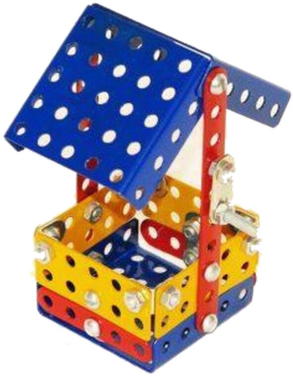 Набор включает в себя металлические пластинки разных форм и размеров с отверстиями. Отверстия нужны, чтобы соединять пластинки между собой. Делается это с помощью болтов, гаек, и гаечных ключей, конечно. Кроме того, имеются колеса – для сборки мотоцикла. Детали уложены в пластиковую коробку с тремя отделениями и прозрачной крышкой.