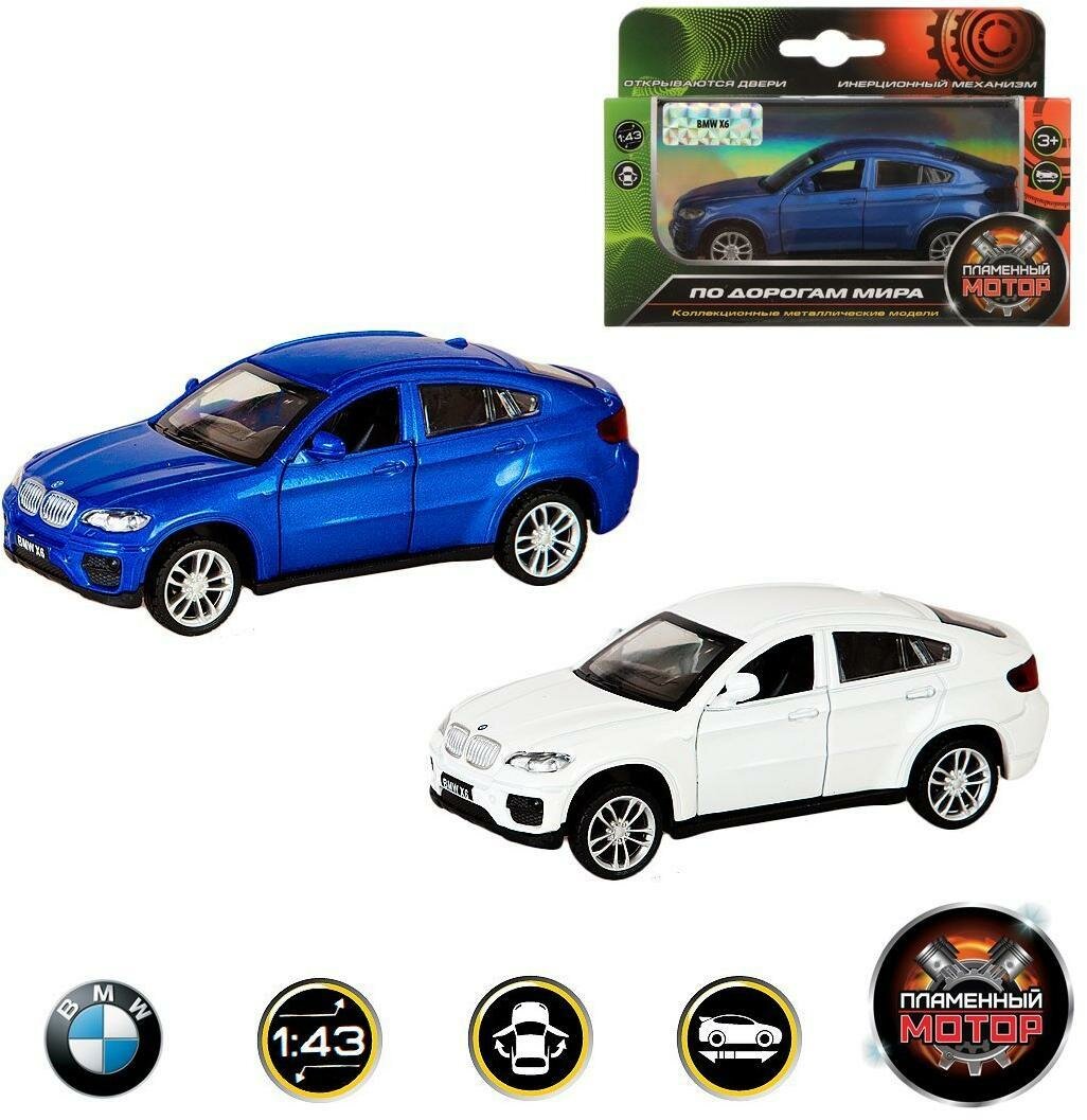 Уменьшенная металлическая копия автомобиля BMW X6 выполнена в масштабе 1:43. Игрушку отличает тщательная детализация и интересная функциональность - у машинки открываются передние двери, а ещё она оснащена инерционным механизмом движения.
