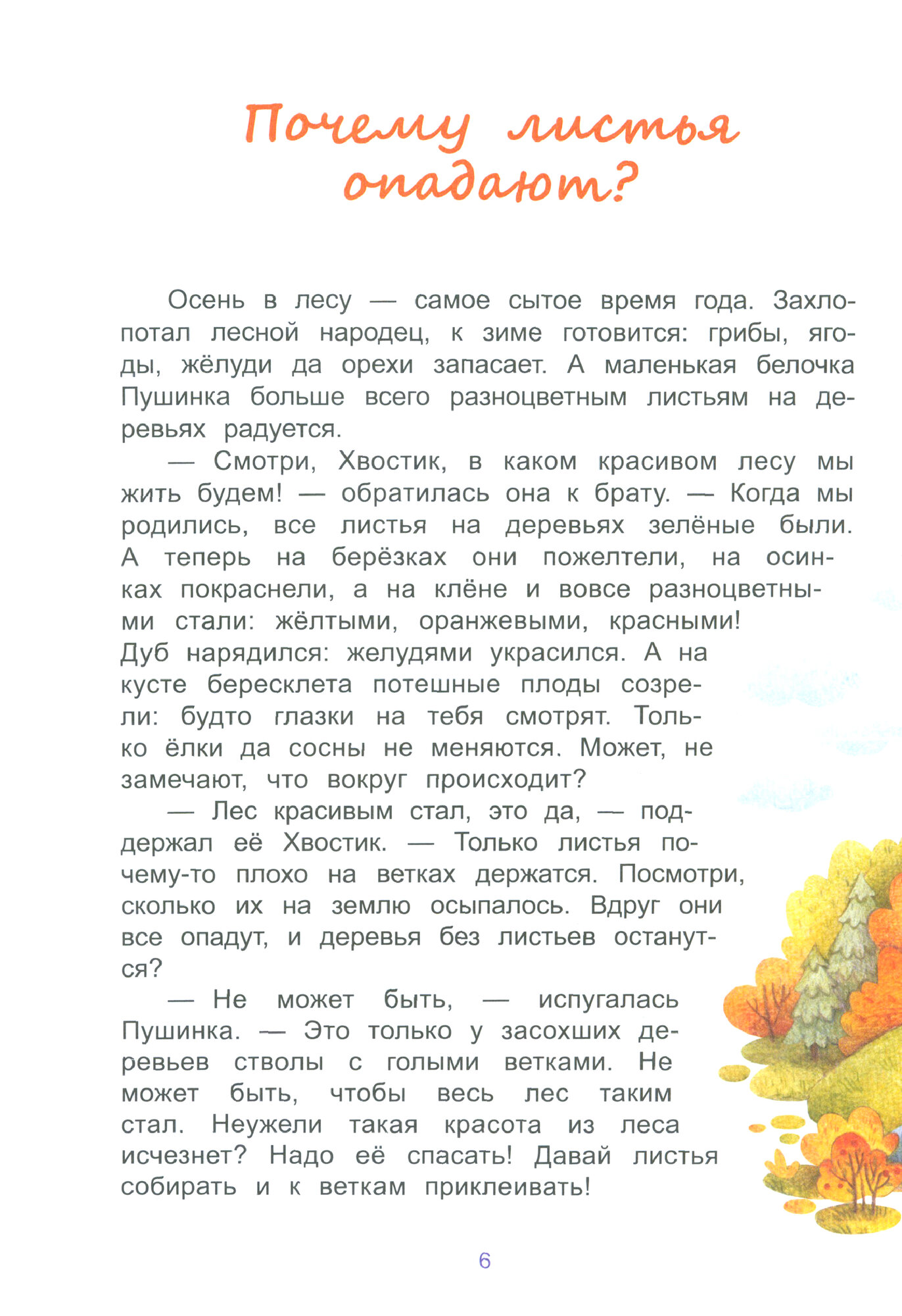 Любознательные бельчата, Пушинка и Хвостик, совсем недавно появились на свет, и им многое нужно узнать. Первую загадку им сама осень загадала: почему листья в лесу опадают? Только решили малыши эту задачу, как новые подоспели, одна другой интереснее. Как лопух ходить научился? Зачем глухари камни глотают? Разобрались бельчата с многочисленными осенними секретами обитателей леса, а там и зима пришла - с новыми загадками. Зачем лисы в снег ныряют? Почему лось рога сбрасывает?.. Весну Пушинка и Хвостик встретили повзрослевшими, но всё такими же любопытными. С первыми лучами тёплого солнышка стали они разбираться, кто из птиц первым на родину возвращается и для кого цветы растут. Ну а летом в лесу жизнь так и кипит - просто раздолье для пушистых следопытов. Они выяснили, кто не птица, а летает, и прошли по следу таинственных невидимок.