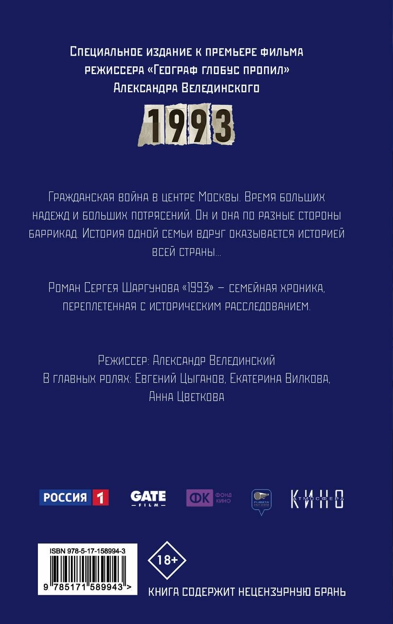 Специальное издание романа к премьере фильма режиссера "Географ глобус пропил" Александра Велединского1993. Гражданская война в центре Москвы. Время больших надежд и больших потрясений. Он и она по разные стороны баррикад. История одной семьи вдруг оказывается историей всей страны...Роман Сергея Шаргунова "1993" — семейная хроника, переплетенная с историческим расследованием.Режиссер: Александр ВелединскийВ главных ролях: Евгений Цыганов, Екатерина Вилкова, Анна Цветкова