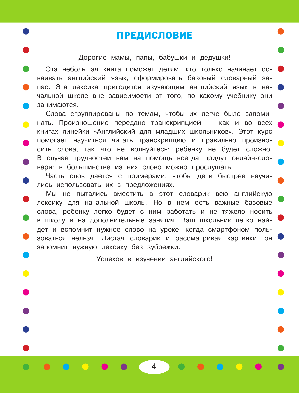Как запомнить английские слова, когда только приступаешь к изучению языка? Детям в этом помогут яркие иллюстрации! Разглядывая картинки и читая подписи к ним, легко запомнить и значение, и написание слов. Транскрипция подскажет, как правильно их произносить, а примеры с переводом научат использовать слова в предложениях. С этой маленькой книжкой ученики запомнят 333 слова по 24 темам, которые непременно пригодятся в начальной школе. Удобный формат словарика и мягкая обложка позволяют брать его на занятия, чтобы нужное слово всегда было под рукой.