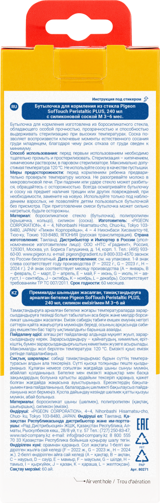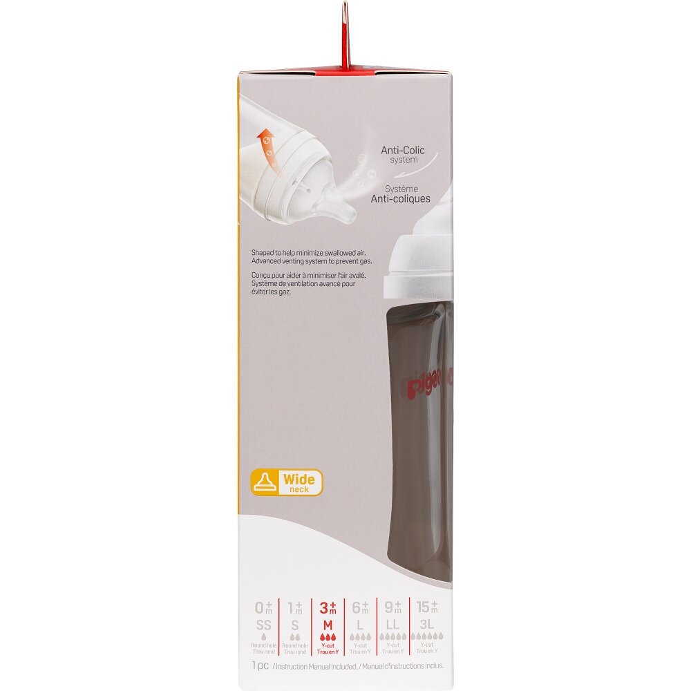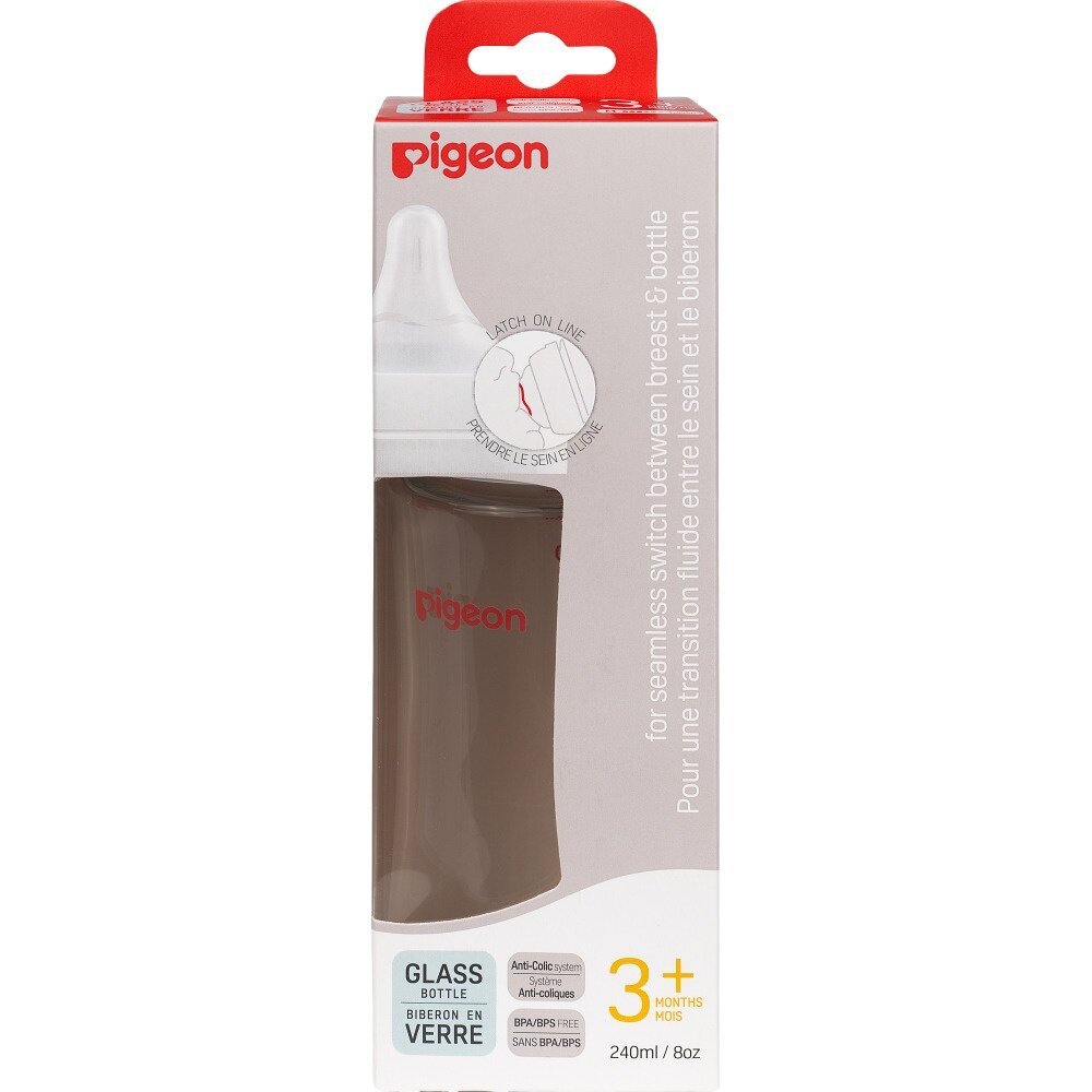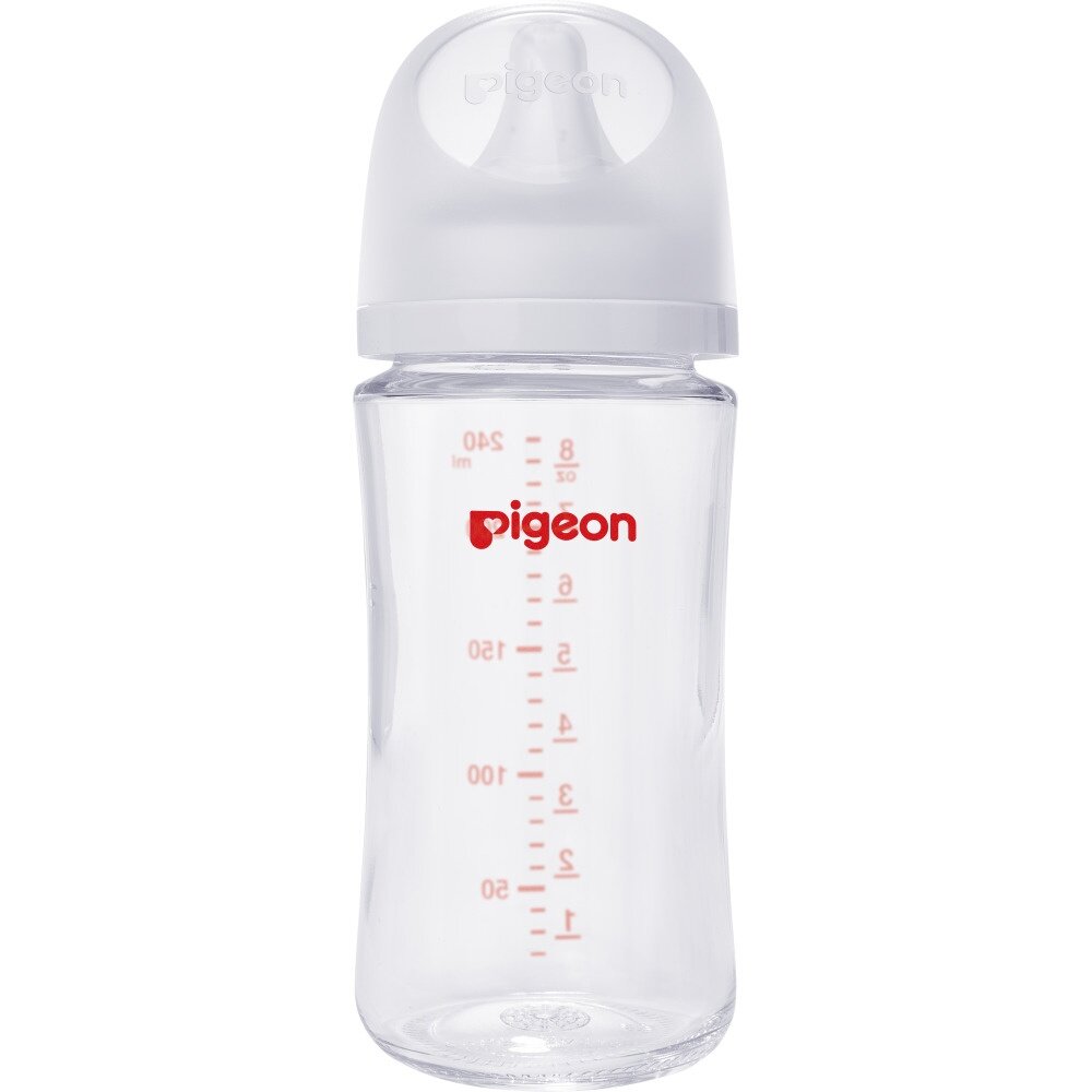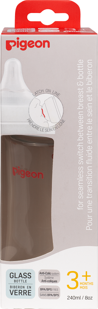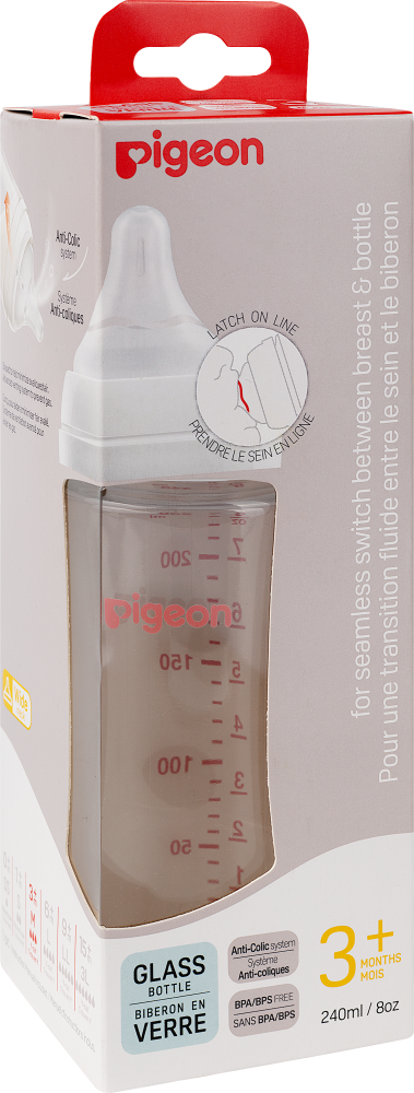 PIGEON Бутылочка для кормления 240мл, премиальное стекло Бутылочка для кормления с новой улучшенной формой соски, приближенной к соску груди матери. Разработана специально для грудных младенцев на основе научно-практических исследований лаборатории Pigeon. Создана в поддержку грудного вскармливания. Не вызывает путаницы сосков. Уникальная конструкция соски позволяет воспроизводить естественные механизмы сосания груди матери. Прошла клинические исследования (НЦЗД РАМН, 2013г.). Соска изготовлена из ультрамягкого, эластичного и плотного силикона. Уникальная конструкция соски стимулирует естественное сосание. Матовая текстурированная поверхность способствует надежному захвату соски. Размер отверстия соски соответствует этапу развития ребенка. Запатентованная вентиляционная система способствует равномерному поступлению молока. Снижает риск возникновения колик. Не рекомендуется использовать бутылочку как заменитель груди в период налаживания кормления грудью. Бутылочка изготовлена боросиликатного премиального стекла (не содержит Бисфенол-А.). Эргономичная форма бутылочки, широкое горлышко позволяет легко промыть бутылочку. В комплекте с соской (размер М, 3-6 мес.). Запасные соски можно приобрести отдельно. Подходит к молокоотсосам Pigeon. Перед кормлением обязательно проверяйте температуру жидкости.