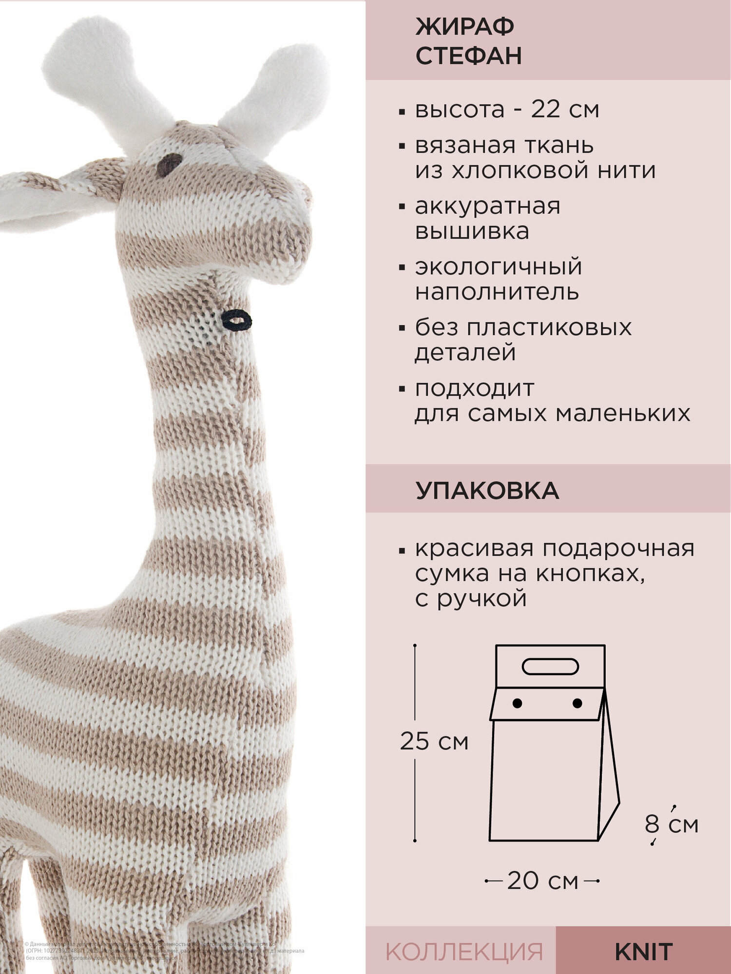 Полосатый и обаятельный жирафик по имени Стефан - представитель не только африканской фауны, но и лимитированной коллекции "Knit". Жираф связан из качественной хлопковой нити, рожки и внутренняя часть ушей из плюша, а на конце хвостика - кисточка. Благодаря своей пастельной расцветке и возможности стоять на лапках, Стефан украсит практически любой интерьер спальни или гостиной. Такой персонаж порадует в качестве подарка и взрослых и детей. Жираф упакован в плотную прозрачную брендированную сумочку на кнопках, в которой приятно вручать подарок. Высота мягкой игрушки - 22 см. Игрушку можно стирать в щадящем режиме при температуре не более 30' и низких оборотах. Игрушка изготовлена из безопасных гипоаллергенных материалов. Товар сертифицирован.