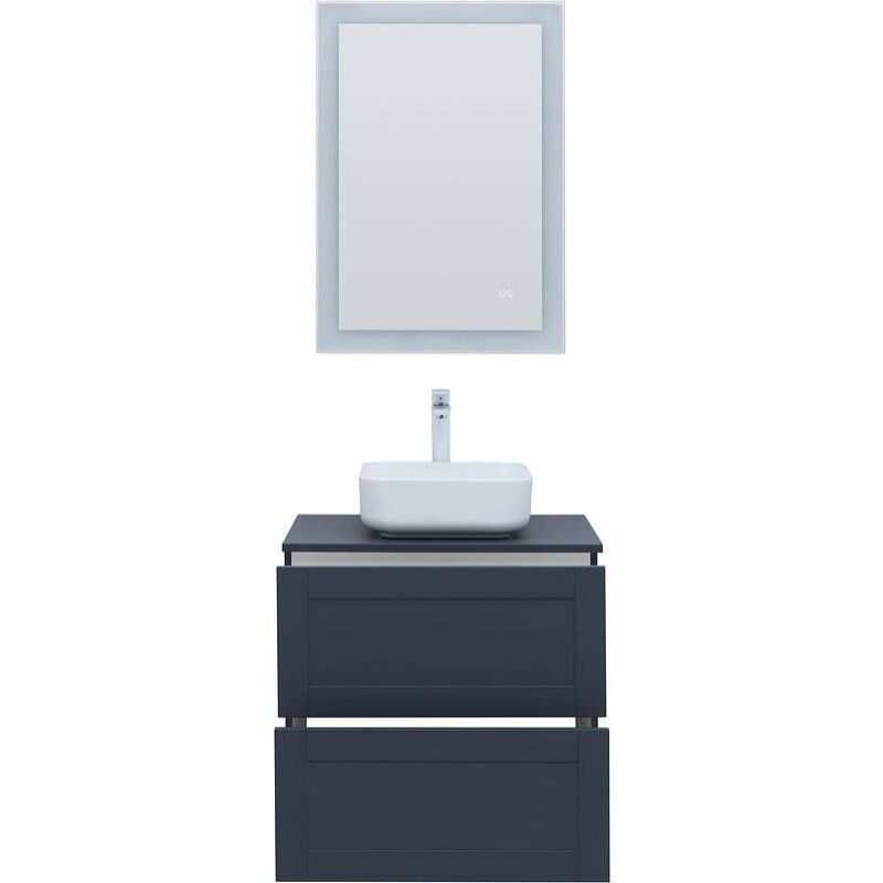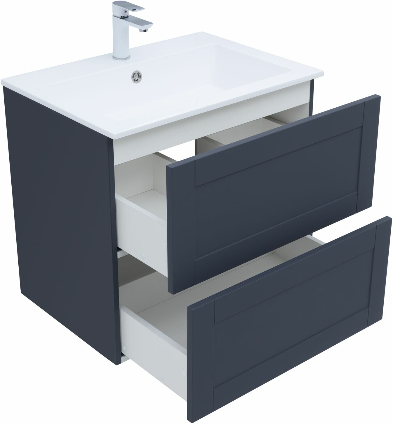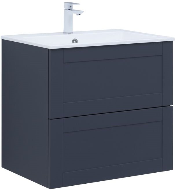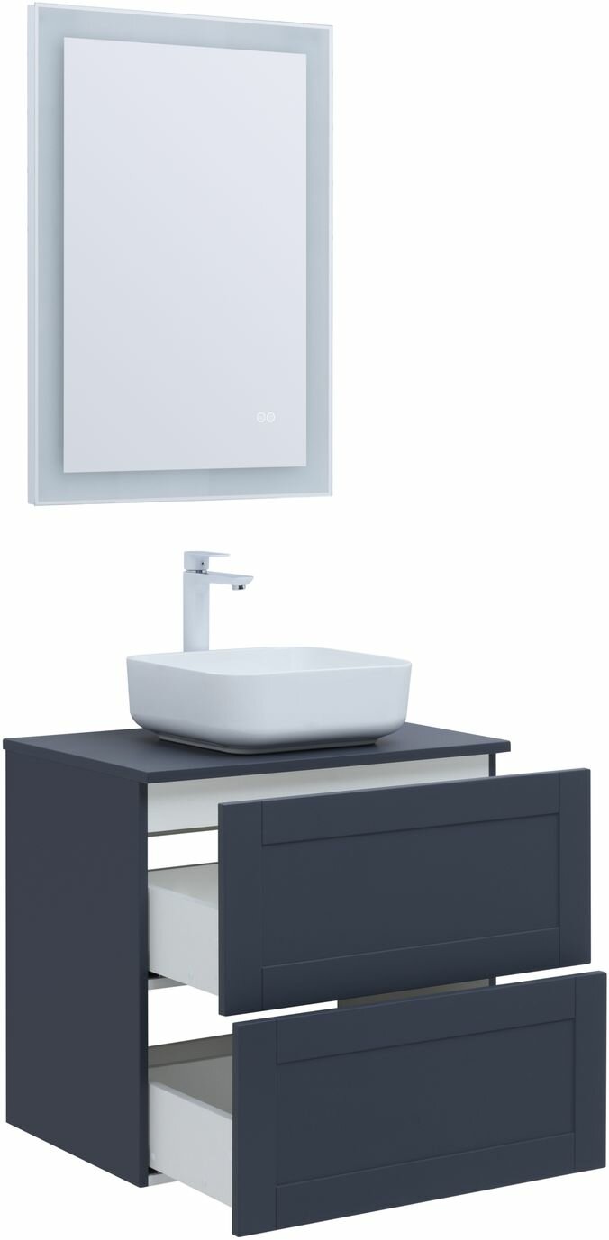 Тумба под раковину. Для изготовления фасадов и корпусов используется суперматовая пленка ПВХ повышенной прочности с эффектом Soft touch. Тумба имеет приятную, бархатистую на ощупь поверхность, устойчивую к царапинам и воздействию влаги. Выдвижные ящики открываются нажатием на фасад (направляющие с системой рush-to-open). Материал ящиков и внутренних деталей - ВЛДСП. Цвет-маренго(темно-синий)
