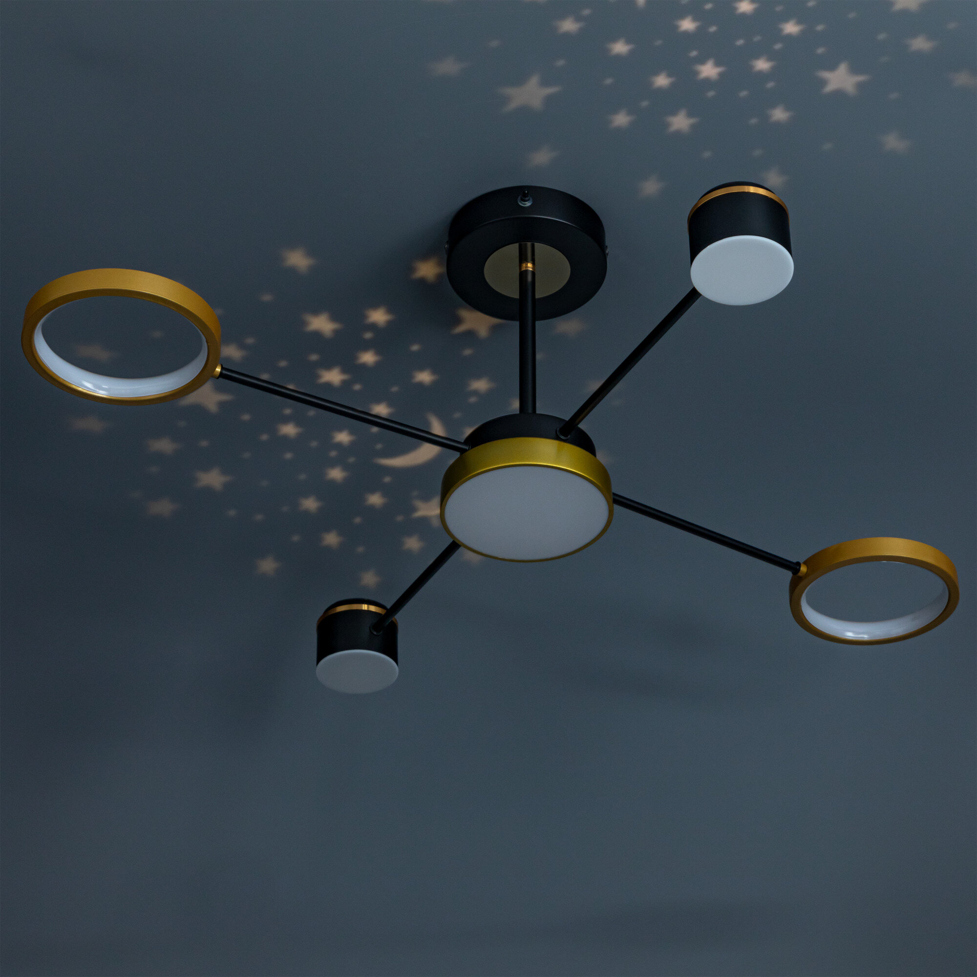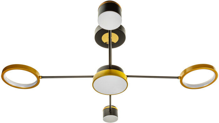 **Люстра светодиодная «Note» 515955** черно-золотистого цвета может настраиваться как с помощью настенного выключателя, так и при помощи пульта управления. Он помогает менять цветовую температуру в диапазоне от 2700 до 6400 К, выбирая комфортный вариант. Допускается монтаж к низкому потолку с помощью планки. Люстра используется в помещениях площадью 17 м².
