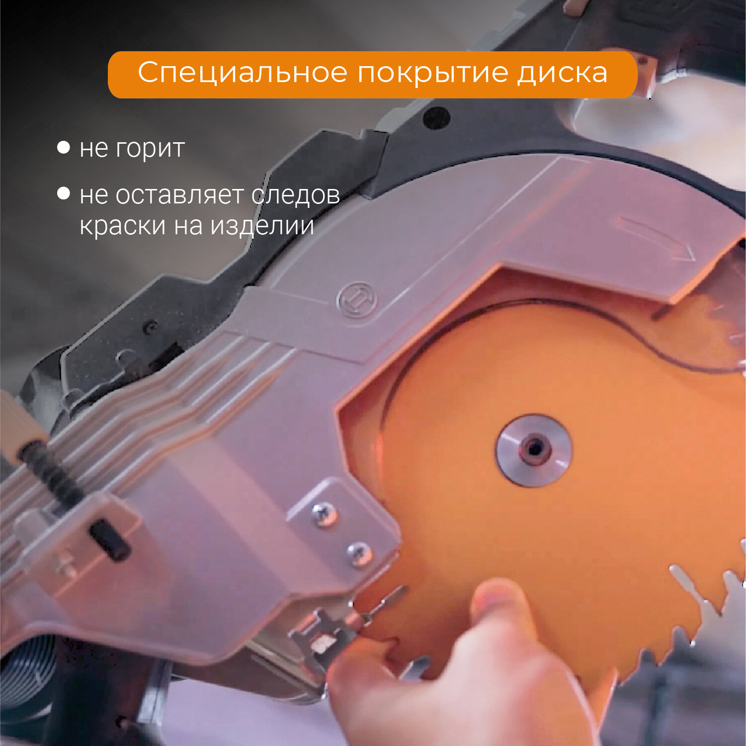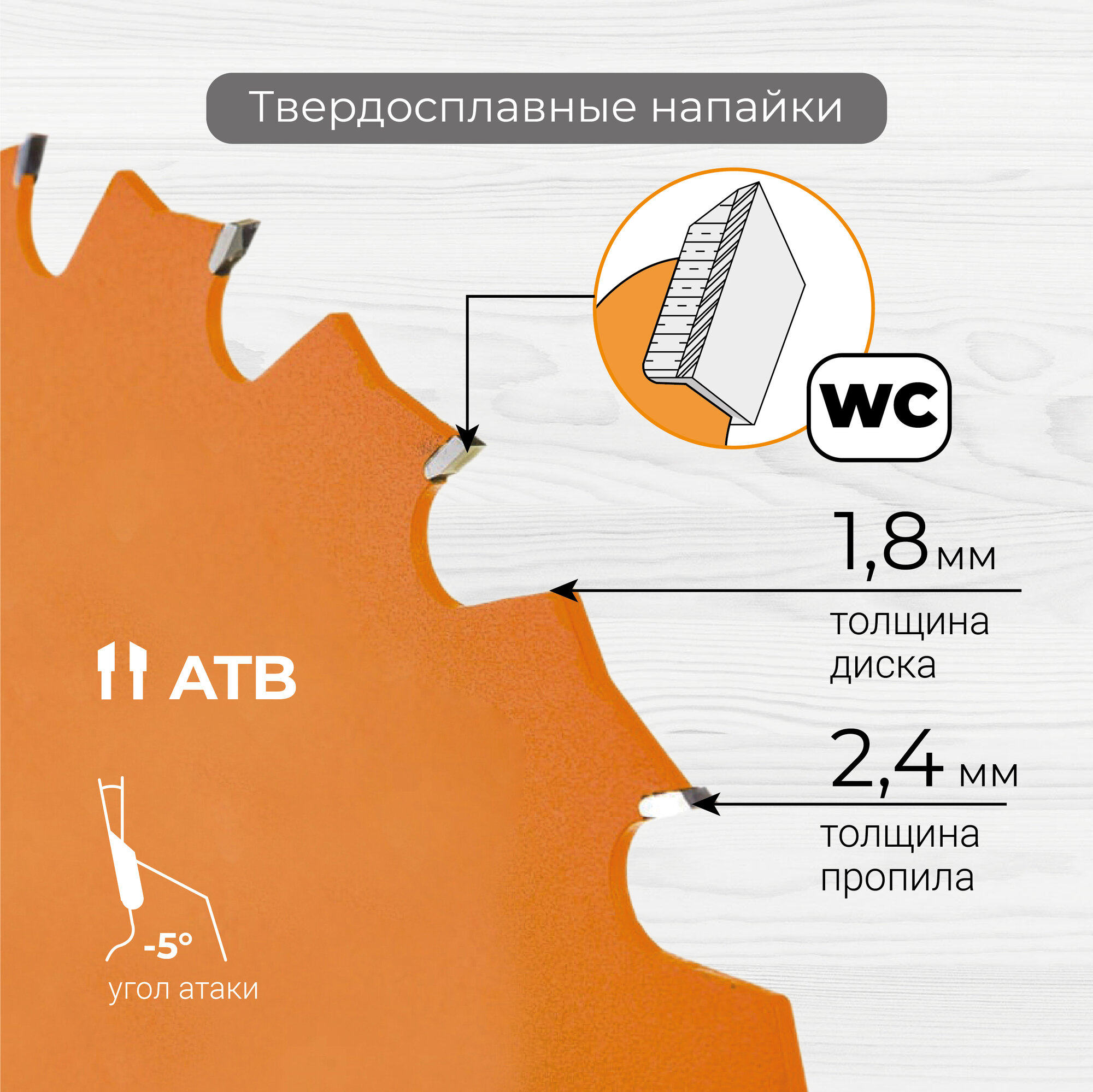 Для чистого распила цельной и слоеной древесины, ДСП с покрытием или фанеровкой, МДФ, композиционных материалов. Попеременно скошеные зубья тип АТВ, угол скоса 15° и отрицательный угол атаки -5° обеспечивают чистую и аккуратную кромку при распиле. В комплекте переходные кольца под посадочный диаметр 25.4 20 и 16 мм допускается эксплуатация диска с потерей зубьев до 20% не в подряд.