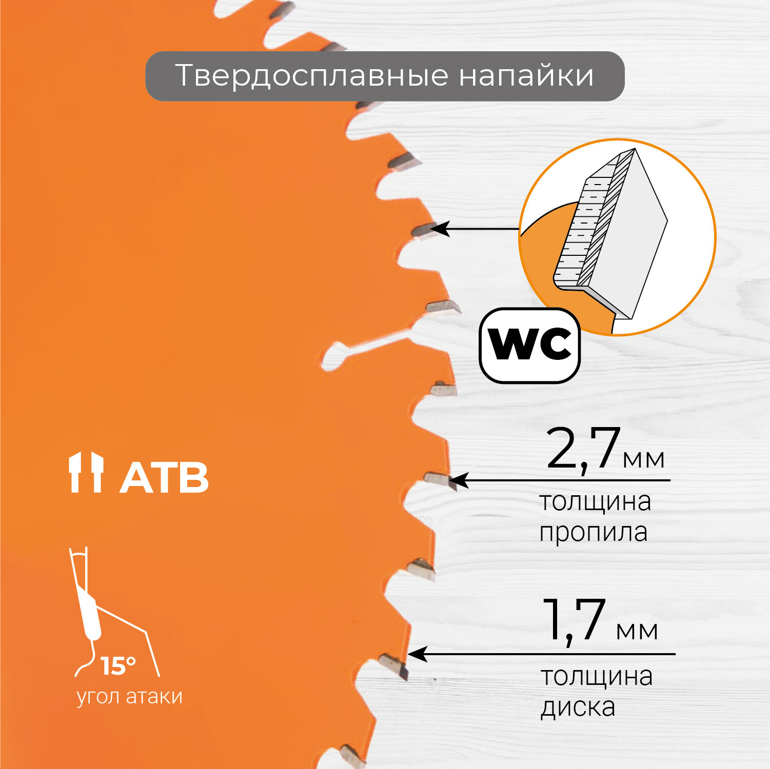 Для продольного и поперечного распиливания твердых пород древесины. Попеременно скошенные зубья тип АТВ, положительный угол атаки 15° и повышенное число зубьев обеспечивают точный и чистый распил. В комплекте переходные кольца под посадочный диаметр 25.4, 20 и 16 мм.