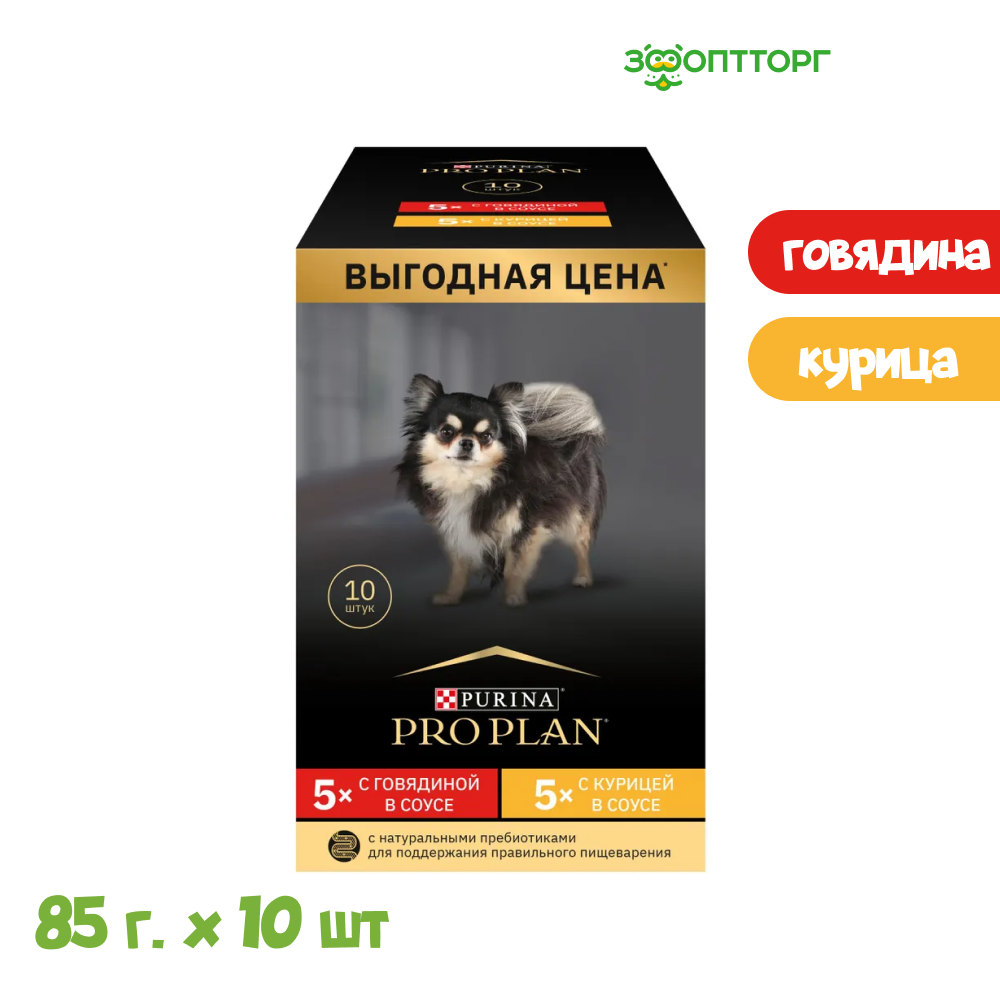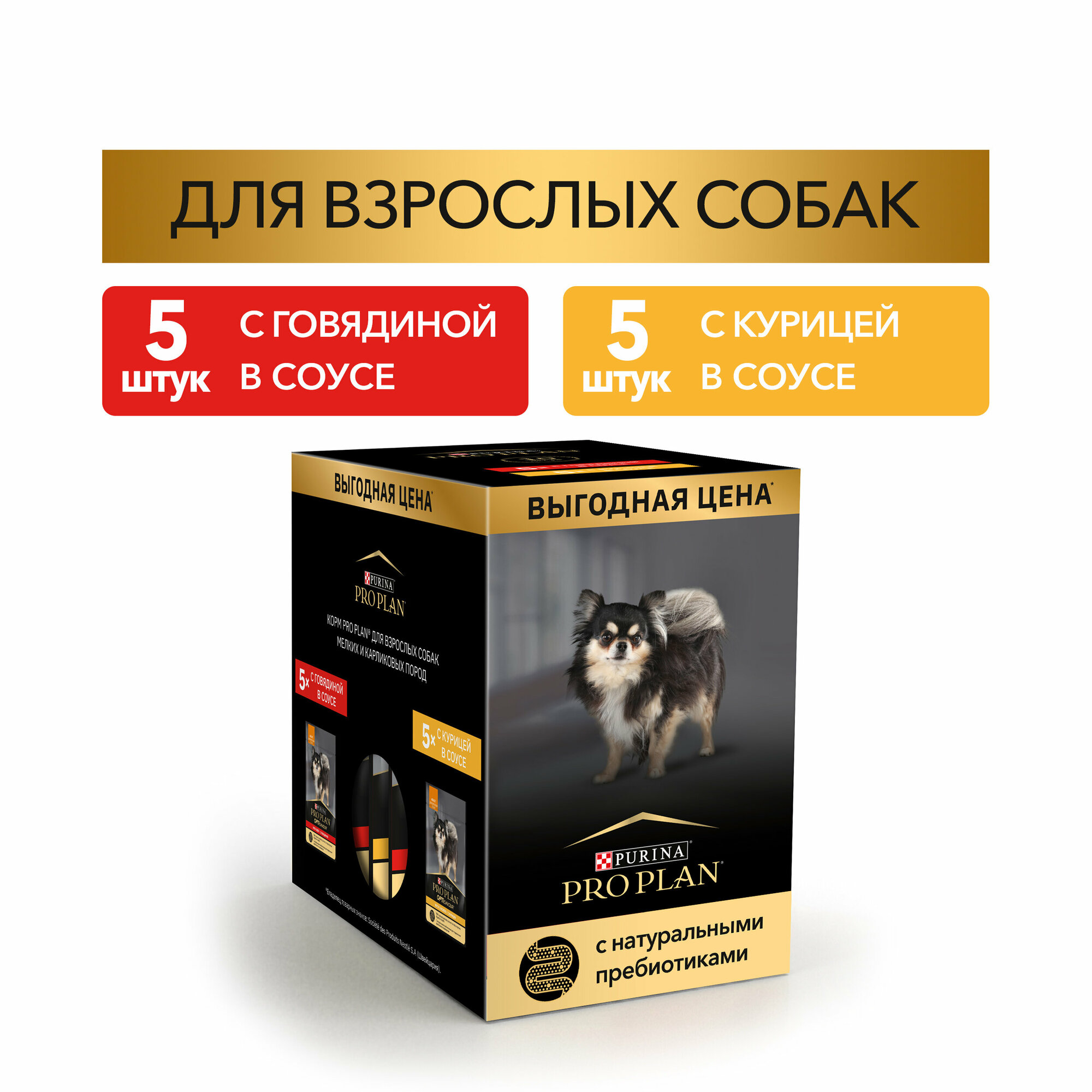 Влажный корм Pro Plan набор для взрослых собак мелких и карликовых пород, с говядиной в соусе 5 х 85 г, с курицей в соусе 5 х 85 г.
