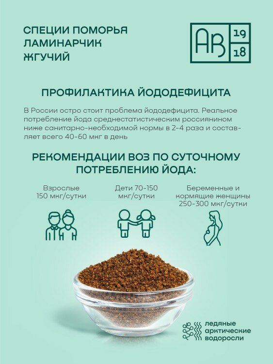 Задать перца всем простудным заболеваниям, проворным бактериям и безвкусным харчам поможет Ламинарчик Жгучий. Природная профилактика йоддефицита обретает повышенный градус остроты и вкусности. Поморская специя Ламинарчик Жгучий – это любимая добавка для первых, вторых и еще бесчисленного количества повседневных блюд. Ламинария наполнит их йодом, Омегой-з, витаминами группы В и аминокислотами, а острый красный перец – цинком, селеном, витаминами А и Е. Жгучая и морская профилактика зоба, тромбоза, воспалений. Специи Поморья – это коллекция универсальных приправ, содержащих водоросли в качестве источника биодоступного йода. Этот минерал является необходимым компонентом для синтеза гормонов щитовидной железы. Его недостаток пагубно отражается на состоянии всех систем организма взрослых и детей. Сбалансированное питание помогает избежать йоддефицита. Эффективно обогащать пищевые продукты жизненно важными веществами можно регулярно, не изменяя своим привычкам, вкусно и приятно. Специи Поморья с беломорскими водорослями просты по составу и многогранны по содержанию нутриентов. Больше Архангельского вкуса на любой кухне – больше йода в любом блюде! Рекомендации по применению: добавлять в салаты, готовые первые и вторые блюда по вкусу. Предупреждение: не рекомендуется применять при индивидуальной непереносимости морепродуктов, повышенной чувствительности к йоду и гиперфункции щитовидной железы.