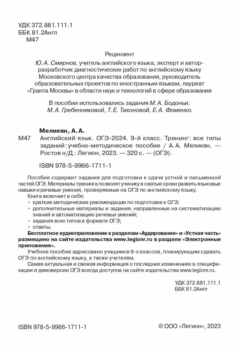 ОГЭ-2024. Английский язык. 9-й класс. Тренинг. Все типы заданий (Меликян А.А.); Легион, 2023