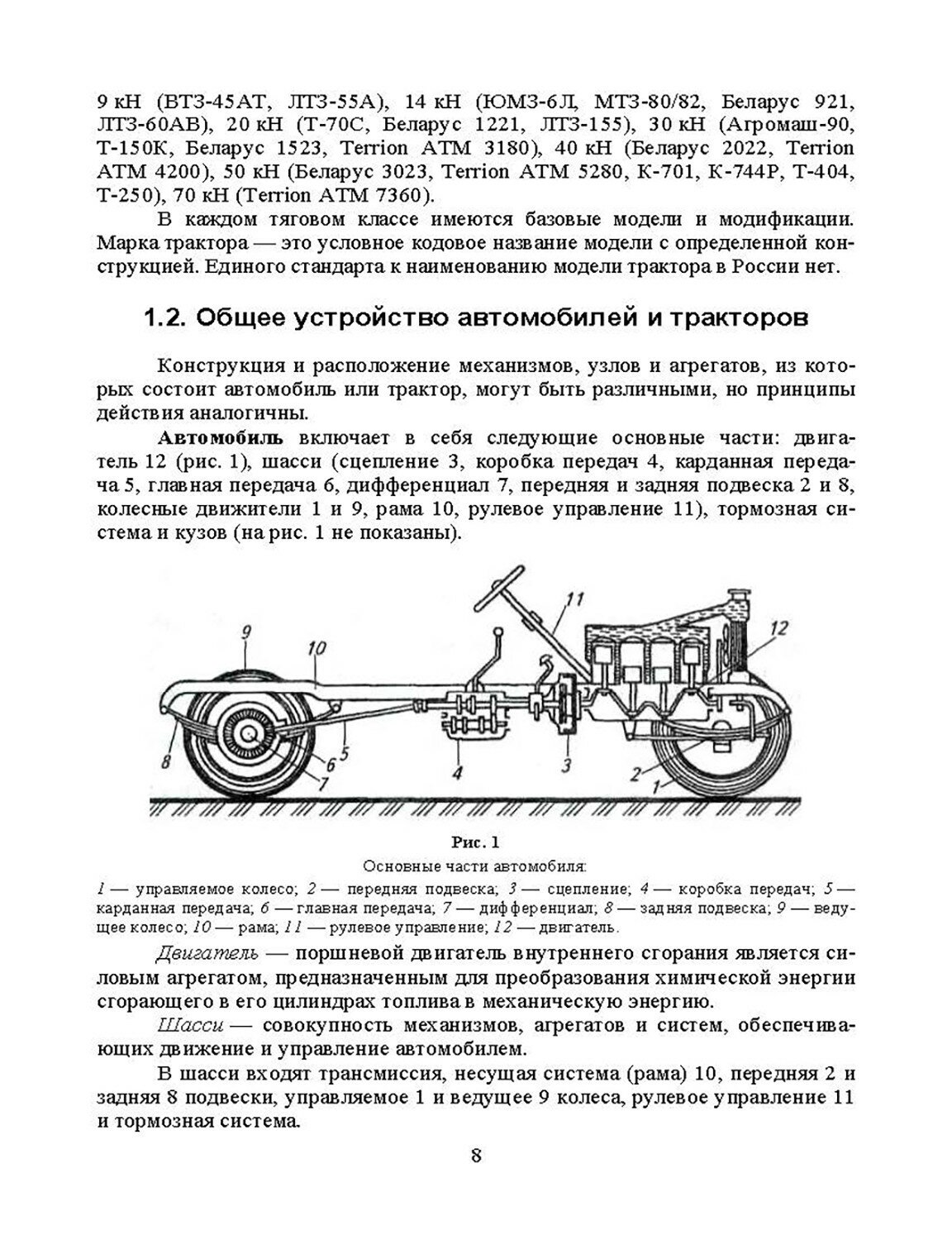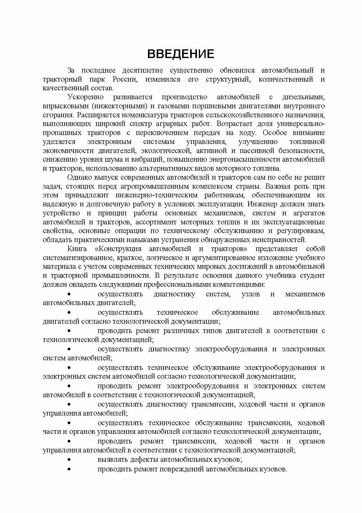 В учебнике приведена классификация, маркировка и описание общего устройства автомобилей и тракторов. Подробно рассмотрены вопросы, связанные с устройством и принципом действия поршневых дизельных, карбюраторных, газовых и инжекторных двигателей внутреннего сгорания, их отдельных механизмов и систем, в том числе электронных систем управления бензиновыми и дизельными двигателями. Дана классификация, описано устройство и принцип действия агрегатов шасси, механизмов управления и тормозных систем автомобилей и тракторов, включая электронные системы управления трансмиссией, подвеской и тормозами. Приведены общие сведения об электрооборудовании, описаны системы электроснабжения, потребители электрической энергии, рабочее и вспомогательное оборудование автомобилей и тракторов. Рассмотрены конструктивные особенности гибридных автомобилей, их узлов и агрегатов. Дана информация по ассортименту автомобильных бензинов, дизельных и газообразных топлив, изложены основы технического обслуживания автомобилей и тракторов.