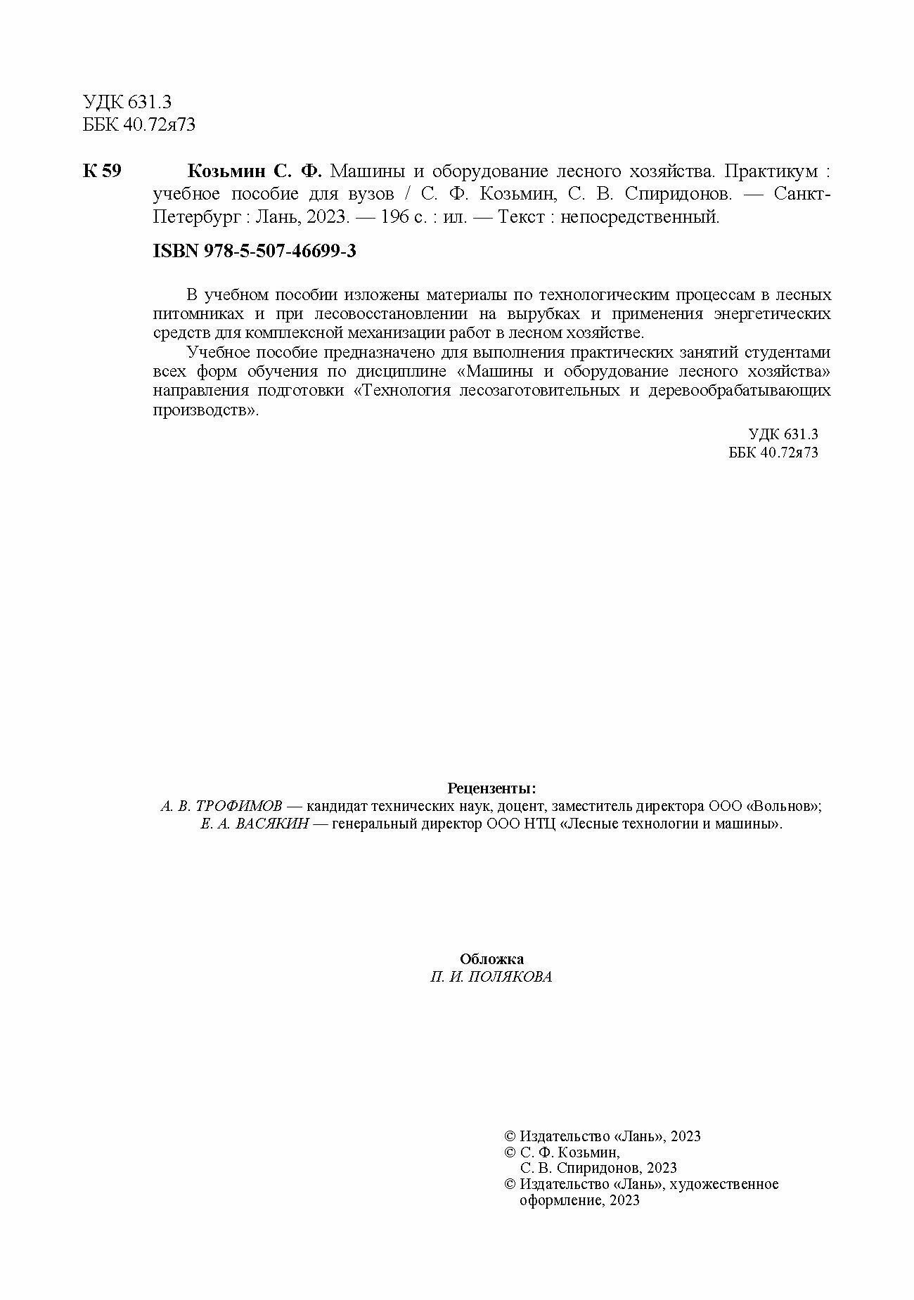 Машины и оборудование лесного хозяйства. Практикум. Учебное пособие для вузов (Козьмин Сергей Федорович, Спиридонов Сергей Васильевич); Лань, 2023