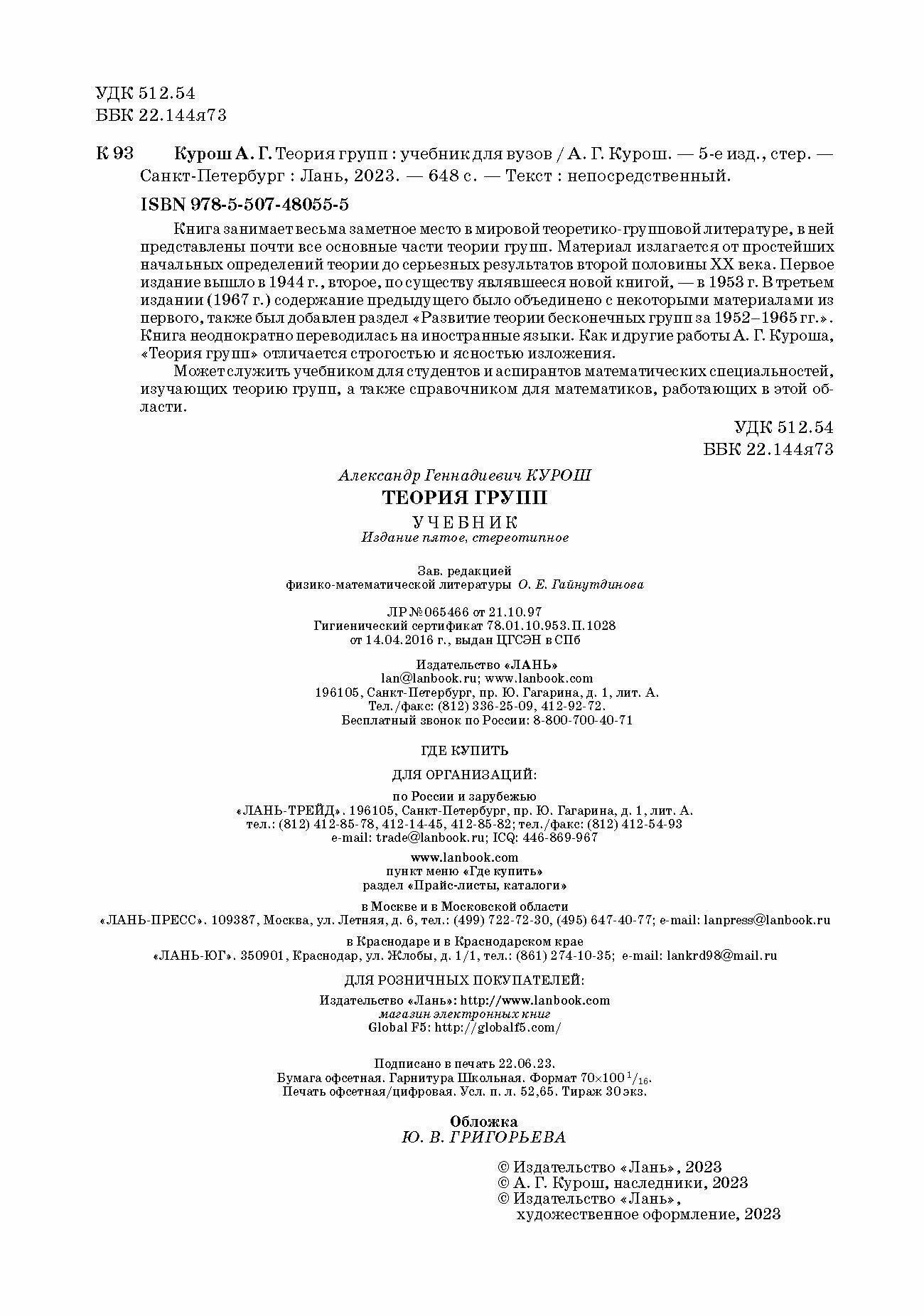 Теория групп. Учебник для вузов (Курош Александр Геннадиевич); Лань, 2023