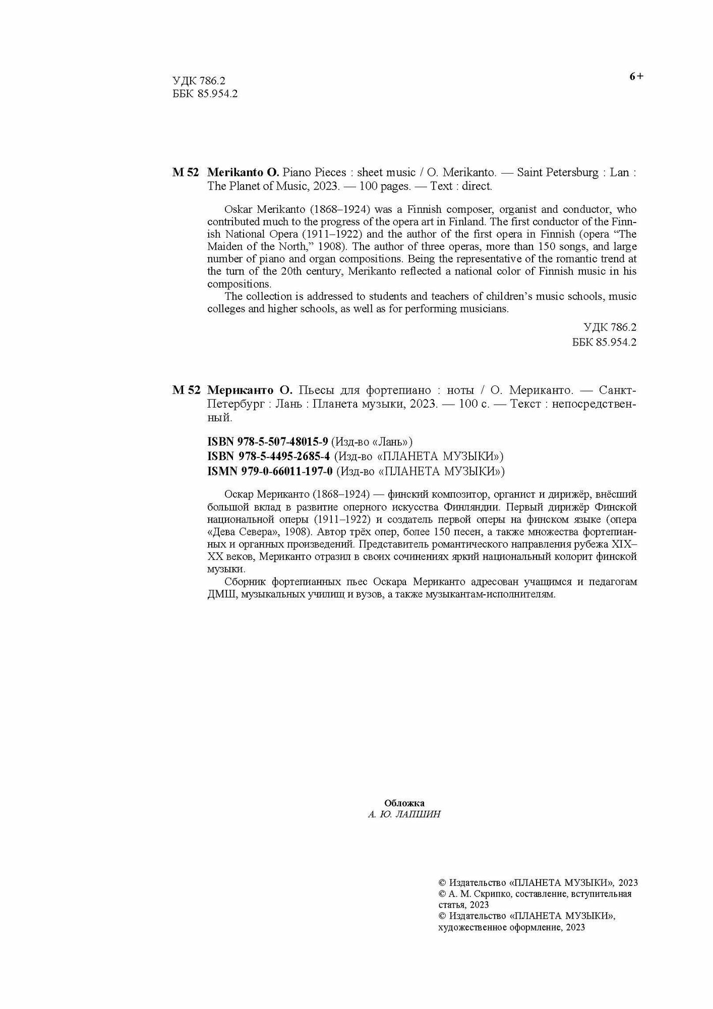 Сборник фортепианных пьес Оскара Мериканто адресован учащимся и педагогам ДМШ, музыкальных училищ и вузов, а также музыкантам-исполнителям.