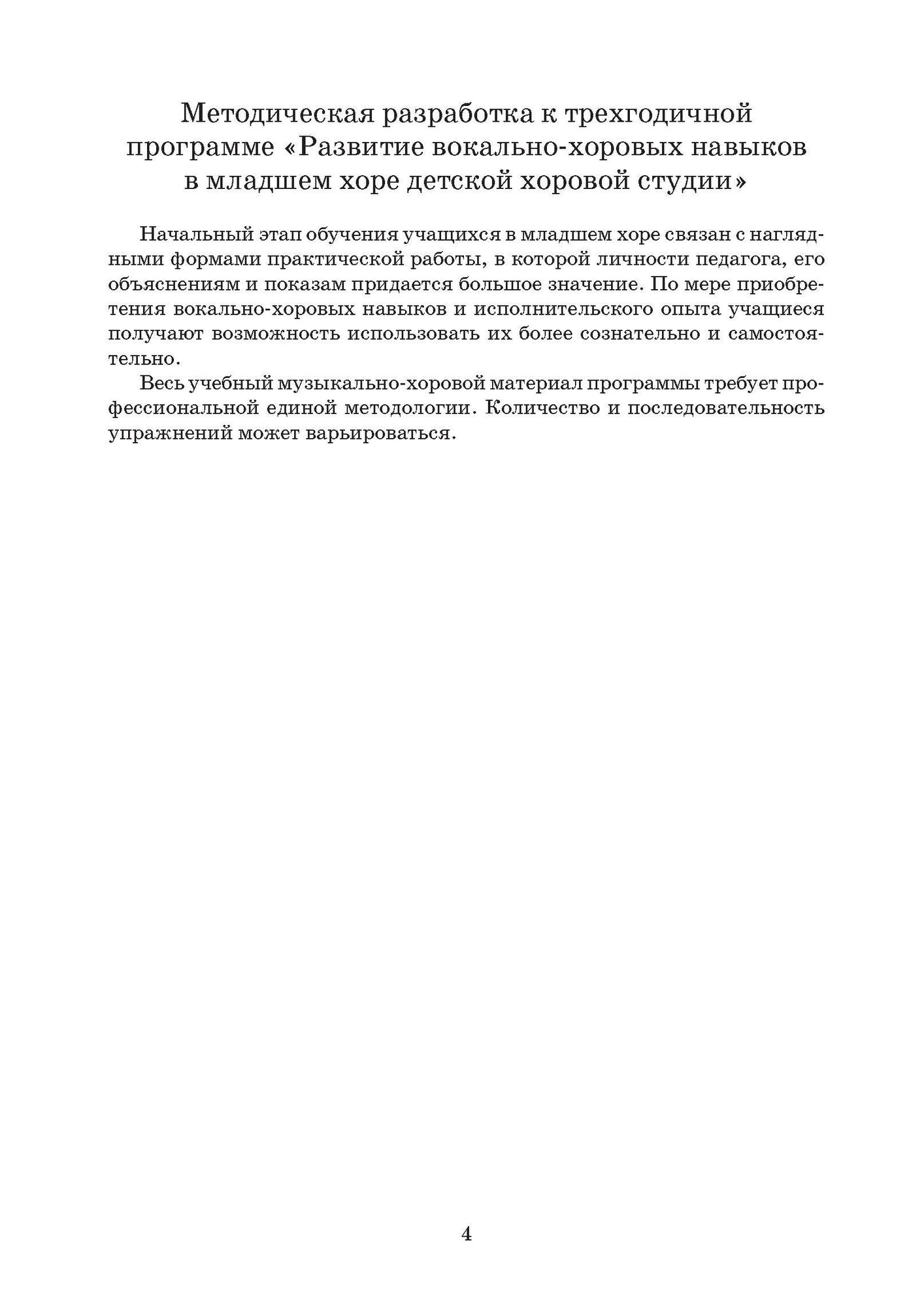 В данной работе подробно освещается разработанная автором методика освоения базовых вокально-хоровых навыков в младшем хоре, развитие музыкального слуха, ритма, а также рассматриваются вопросы организации и проведения учебно-репетиционного процесса с учащимися младшего возраста. Материал, предлагаемый в методической разработке, служит основой в обучении детей. При этом его насыщение может быть дополнено упражнениями самих педагогов. Рассчитано на трехгодичное обучение.